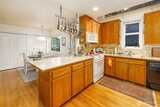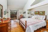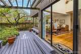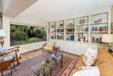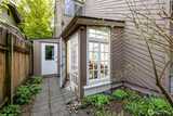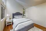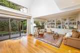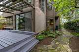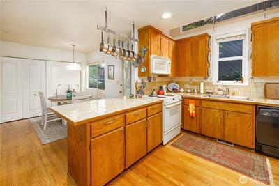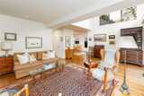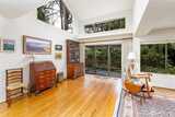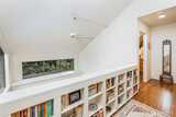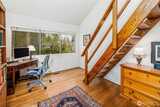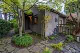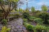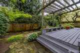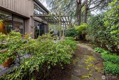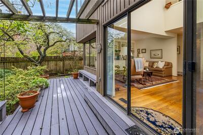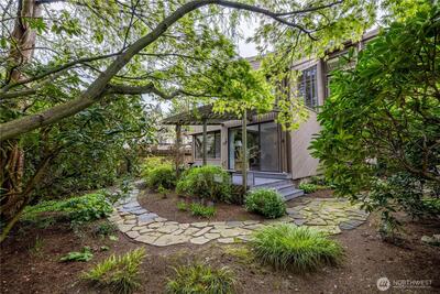 Nestled among lush, mature landscaping, this distinctive 1978 Northwest Contemporary offers a rare sense of privacy and connection to nature. Meandering stone pathways, layered greenery, and a welcoming entry set the tone for a home that feels like a peaceful retreat. Inside, soaring ceilings and expansive walls of windows invite natural light to pour in while framing tranquil garden views at every turn. The main living spaces feature warm hardwood floors and a stunning wall of custom built-in bookcases, blending architectural character with everyday comfort. Large sliding glass doors create a seamless flow to the entertainment-sized deck, complete with a pergola, perfect for outdoor dining, relaxing, and year-round enjoyment. The kitchen, with its generous island and adjoining breakfast room, offers an inviting space for casual gatherings and morning light. A main-floor bedroom, currently used as a den, adds flexibility for guests or a home office. Upstairs, three bedrooms and two bat