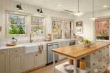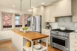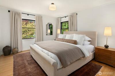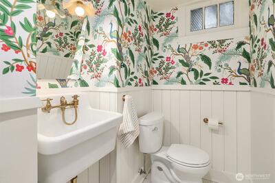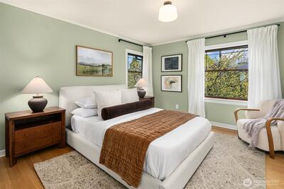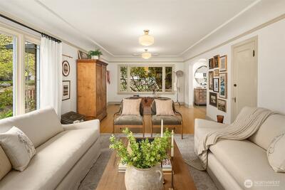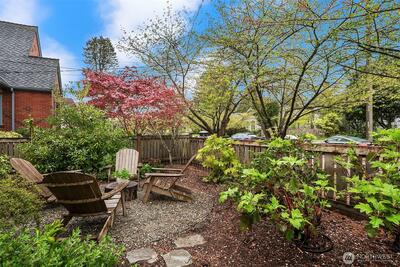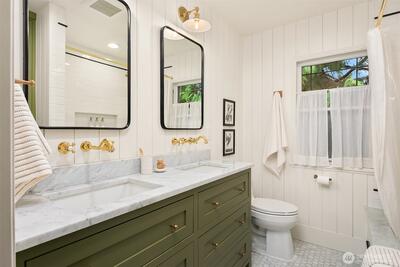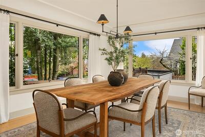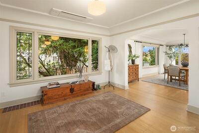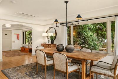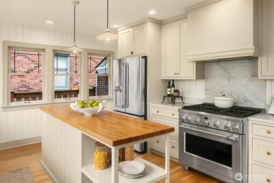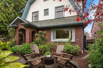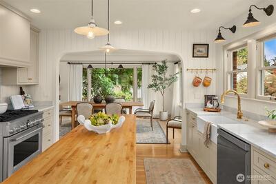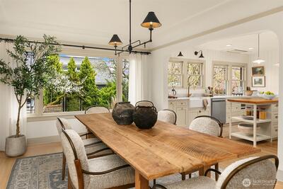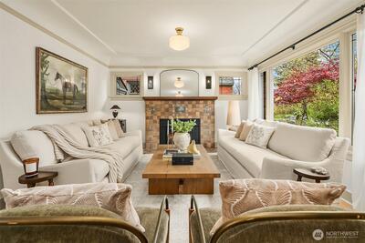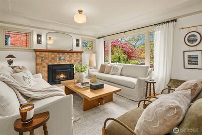 Welcome to your dream home in the quintessential Seattle neighborhood of Bryant! This beautifully reimagined home seamlessly blends modernity, elegance, and functionality. The home was remodeled by a renowned local designer and the attention to detail is apparent at every turn. Outside, the classic brick exterior charms at first sight, while the lush front yard bursts with vibrant roses and native plants. Upon entry, you'll delight in the natural light, gleaming hardwood floors, and period details like the Batchelder tile fireplace in the living area. A chic half-bath on the main floor adds convenience. At the heart of the home, the fully remodeled kitchen overlooking the garden is a chef’s delight with high-end appliances, marble countertops, and an open layout. Entertaining is easy here with a generous dining room connecting the living and kitchen areas. Upstairs, four spacious bedrooms offer tall ceilings, abundant light, and plenty of room to relax or work. The remodeled upper le