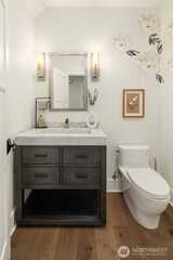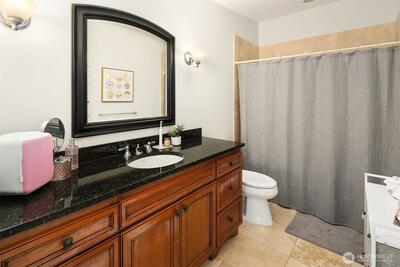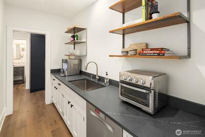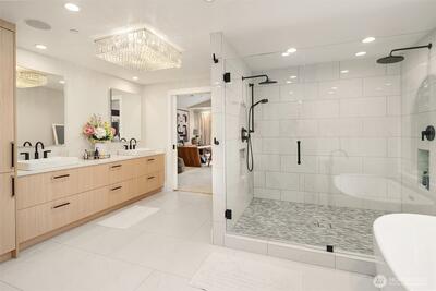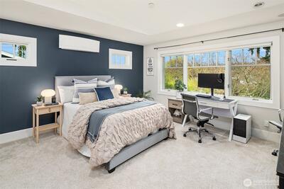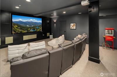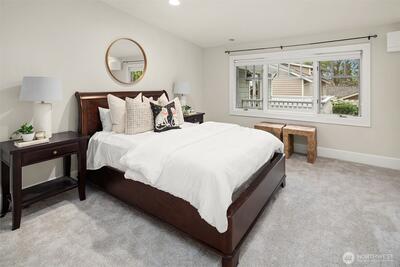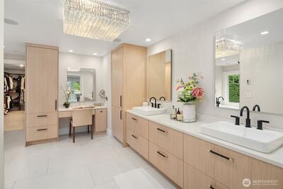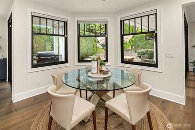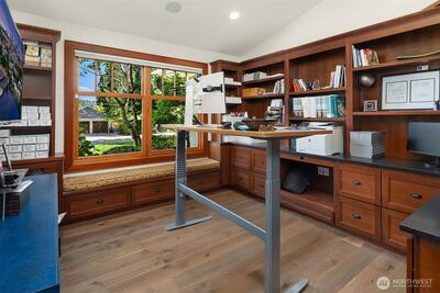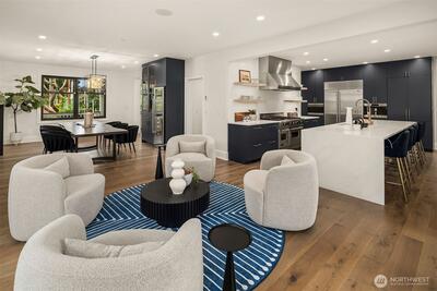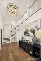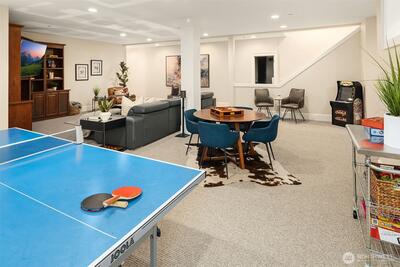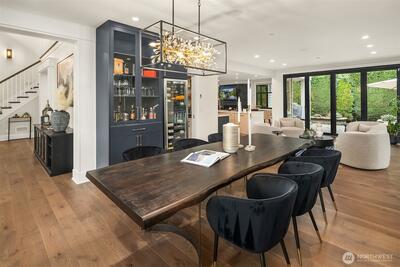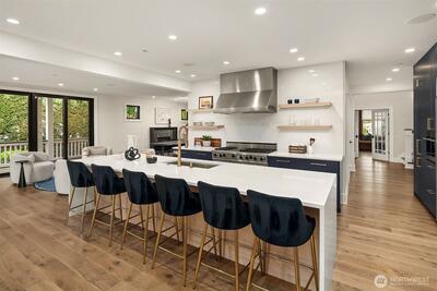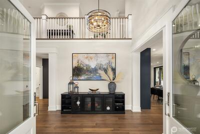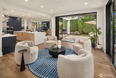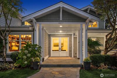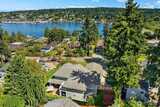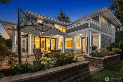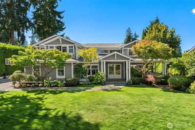 Nestled in coveted Yarrow Point, this beautifully remodeled Craftsman offers the perfect blend of timeless character and modern livability. A dramatic two-story entry sets the stage, leading to an open living and dining layout anchored by an entertainer's kitchen and warm family room. Bifold doors spanning the main living spaces open to a private patio and lawn perfect for cozy nights in, spring entertaining, or casual gatherings. Rich hardwood floors, abundant natural light, and a thoughtful floor plan make everyday living feel effortless, complemented by a wood-paneled office with custom built-ins. Upstairs, four bedrooms include a serene primary suite with spa bath, freestanding soaking tub, large walk-in closet, and peek-a-boo lake views, plus a versatile guest suite, perfect as a bedroom, bonus, au pair, or extended stay space. Downstairs, a full entertainment level delivers a theater, game room, fitness room or guest bedroom, and ample storage. Space and storage abound throughout