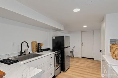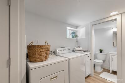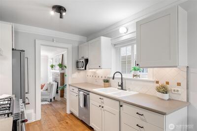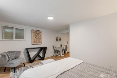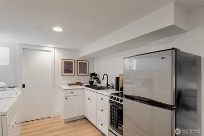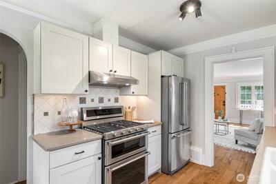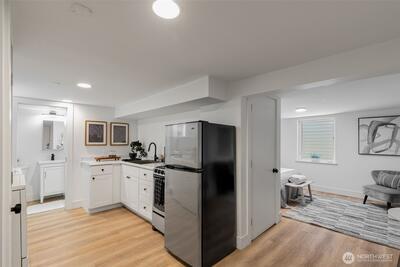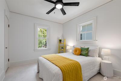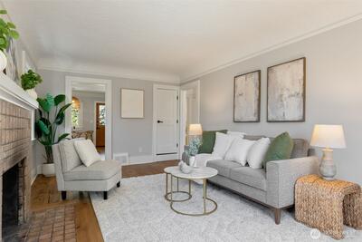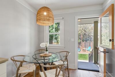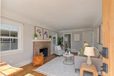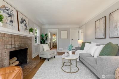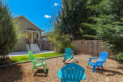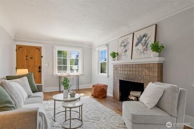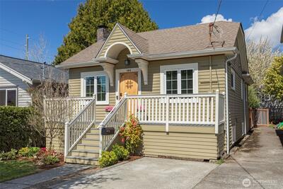 Classic Phinney Ridge charm meets modern flexibility in this thoughtfully updated 1926 Craftsman. The welcoming front porch leads into a light-filled living room with coved ceilings, anchored by an original hand-cast tile fireplace. Two spacious bedrooms and an updated full bath. Kitchen, with stainless appliances, a six-burner gas range, and dining space, features a Dutch door that opens to a sun-drenched backyard, ideal for summer entertaining and late-night campfires. The versatile basement functions as an excellent office, media room, or guest suite, with laundry and a half bath. And here's where it gets interesting: a potential rental studio or MIL / ADU with its own exterior entrance, full kitchen, three-quarter bath, and washer/dryer. House-hack homeownership, host extended guests, or just turn on rental income whenever you want, like during the World Cup this summer! Fresh paint and carpet, newer windows and flooring, and a brand-new high-efficiency furnace. Rare off-street par