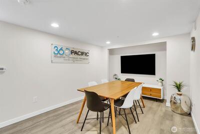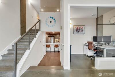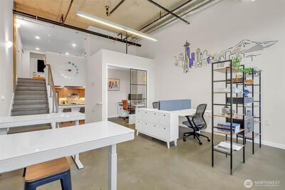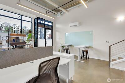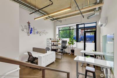 Perfect for office, retail, residential living, or a versatile mix of uses in a highly desirable location. This bright, open space showcases a modern blend of concrete, glass, and steel, offering style, comfort, and flexibility. Features include soaring ceilings, polished concrete and hardwood floors, a well-appointed kitchen, custom blinds, in-unit laundry, A/C, and garage parking. Conveniently located near the Roosevelt light rail, University Village, parks, shops, restaurants, and the University of Washington.