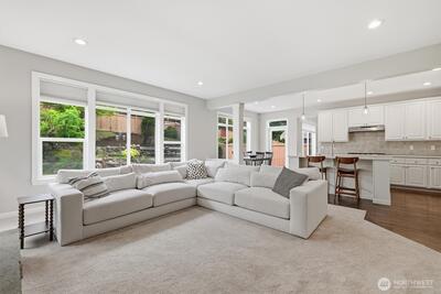 Highly Coveted Crest View Loop charmer! Sits perfectly at the end of the loop providing ample privacy on greenbelt lot. Enter & be greeted w/ rare vaulted ceilings & grand spiral staircase + office on main. Remodeled kitchen flows perfectly for entertaining w/ refinished hardwood floors, SS appliances, new quartz countertops & island w/ seating & storage. Grand wrap around staircase leads you to spacious bedrooms + primary suite w/ custom walk-in closet & 5-piece bath w/ brand new flooring. A/C, updated paint & light fixtures throughout. Greenbelt lot w/ fully-fenced yard + gardening & entertaining space. Additional updates include new solar panels, EV charger in 2-car garage w/ extra storage, new heat pump, Air Scrubber filtration system & furnace + updated roof w/ transferable warranty. Top rated Snoqualmie schools including CVES & Mt. Si HS, community park + walking distance to The Club at Snoqualmie Ridge.