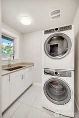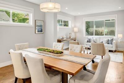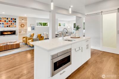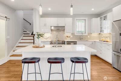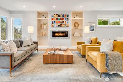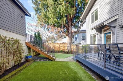 Stunning craftsman home perched high on the street and in mint condition, perfect for today's lifestyle. Three bedrooms upstairs with laundry room, two full baths, and with a balcony and two closets off the generous primary bedroom. The main floor features an open floor plan with eat-in kitchen, pantry, dining and living area with fireplace plus separate formal office. Downstairs has two additional bedrooms, full bath, huge family room with fireplace and a second laundry room plus extra space for a gym. Over-sized two-car garage with electric car charger plus two additional off street parking spaces, gorgeous fenced-in yard and central A/C complete this amazing home. Primary entrance is from off street parking in the back with minimal stairs. A stone's throw to shopping, restaurants, cafes, and Seattle's biggest park- Discovery, tennis courts, and one of the cities hidden gem playgrounds. Less than 20 min to DT Seattle and South Lake Union. Must see in person!
