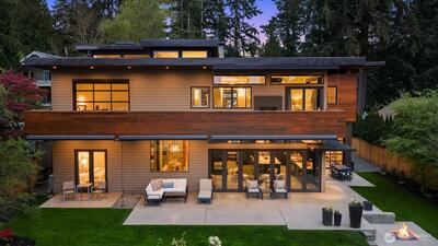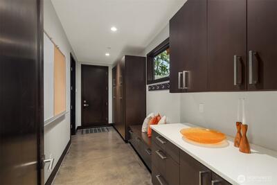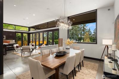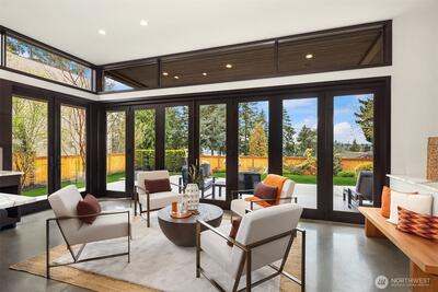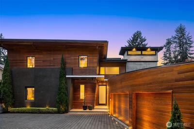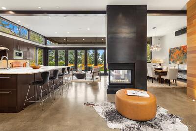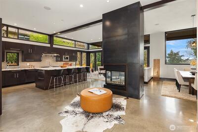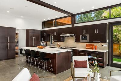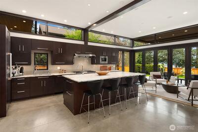 West Bellevue Retreat // Ideally positioned in the heart of West Bellevue, this residence offers a rare combination of privacy, proximity, and protected west-facing views within one of the Eastside’s most sought-after neighborhoods. Set along a quiet, tree-lined street, the home is thoughtfully sited to capture natural light while maintaining a sense of seclusion. Interiors are defined by a clean, functional layout with refined, contemporary finishes throughout. Concrete flooring anchors the main level, complemented by vaulted ceilings and a neutral palette that feels both current and enduring. The kitchen is well-appointed with stone slab countertops, stainless steel appliances, and custom cabinetry, designed to integrate seamlessly with adjacent living and dining spaces. The main level flows effortlessly from formal to informal areas, with connected living spaces that open to the outdoors—creating an easy rhythm for both daily living and entertaining. Floor-to-ceiling glass frame