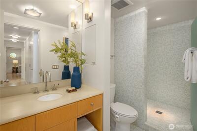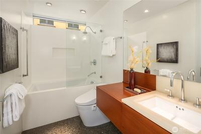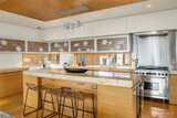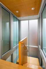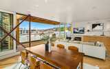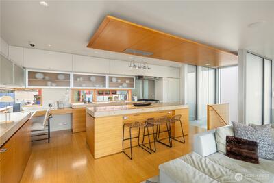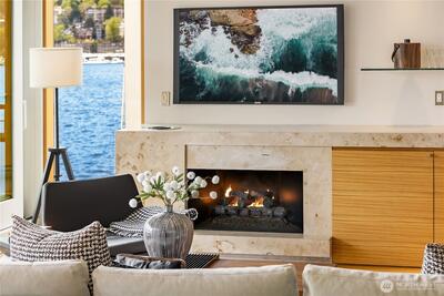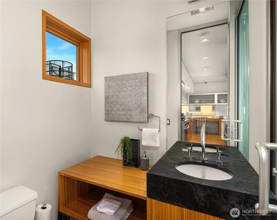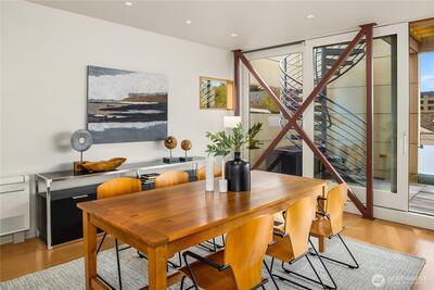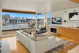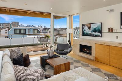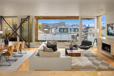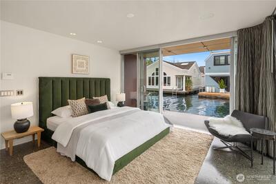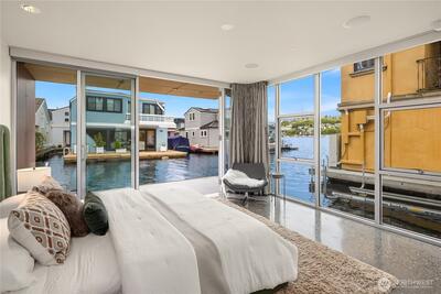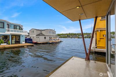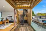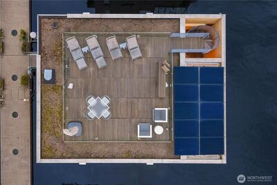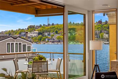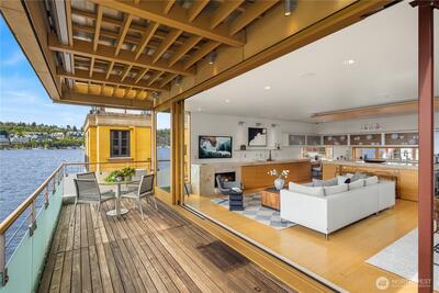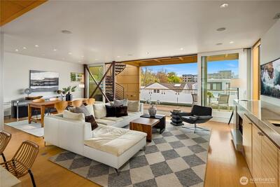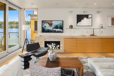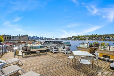 Fairview Landing #6 // Designed by Vandeventer + Carlander Architects, this modern floating home continues Seattle’s rich tradition of life on Lake Union, offering coveted southern exposure and sweeping views of Downtown, Queen Anne Hill, Gas Works Park, the Olympics and Space Needle. Thoughtfully designed, the floorplan inverts a traditional layout by placing public living spaces on the upper level to maximize light, views, and entertaining. Expansive glazing and large sliding doors open to multiple decks, including a rooftop terrace accessed by a sculptural circular stair, creating seamless indoor-outdoor flow. Private spaces are located on the entry level, while a rare underwater lower level with true porthole windows offers an immersive connection to the lake. The home’s carved massing, recessed decks, and material shifts create architectural depth and integrity. Sustainable features include hydronic in-floor heating via energy-efficient heat pump, heat-exchange ventilation, so