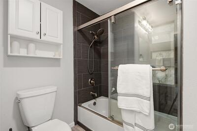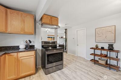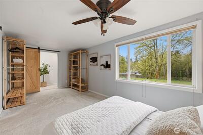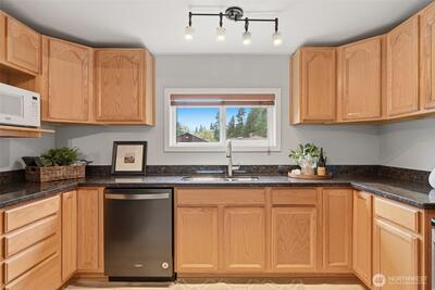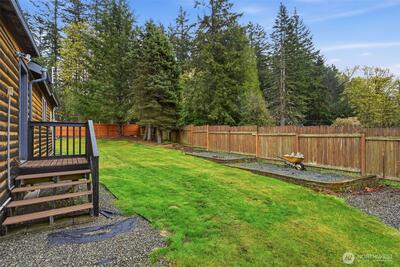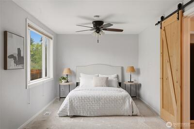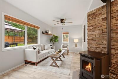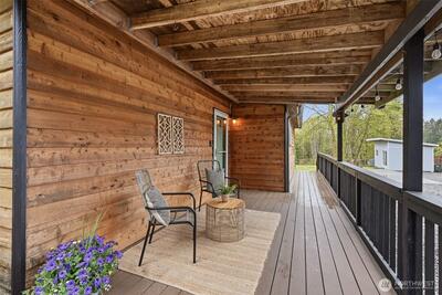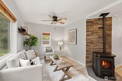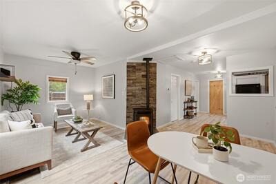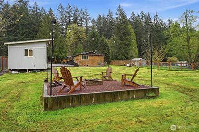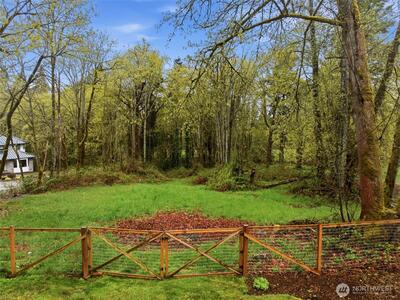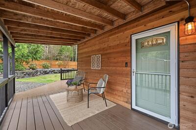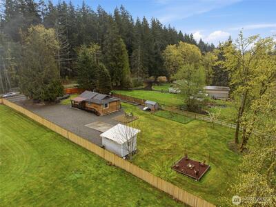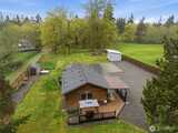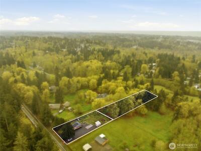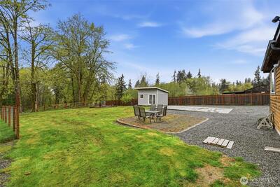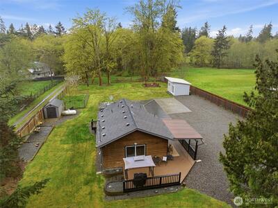 Welcome to your cozy cabin in the city. Wrapped in cedar siding and framed by towering evergreens, this 2-bed, 1-bath Kent retreat sits on 1.463 acres across two separate tax parcels — room to spread out and still have green space to spare. The covered wraparound deck with exposed beam ceiling and string lights sets the tone instantly — whether it's morning coffee, an evening around the fire pit, or simply soaking in the peaceful surroundings. The fully fenced backyard offers room to roam, the expansive gravel lot handles RV, boat, and trailer parking with ease, and a detached outbuilding adds storage or workspace. Inside, fresh LVP flooring, granite countertops, stainless appliances, a spa-inspired bath, and knotty pine barn doors make it warm and move-in ready. Immaculately maintained and lovingly cared for, every detail has been tended to. The pellet stove keeps you cozy all winter long. Steps from Lake Youngs Reservoir and miles of trails, yet minutes from shopping, dining,