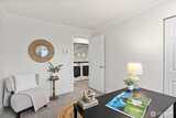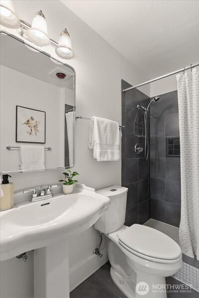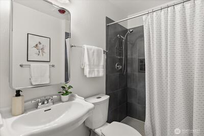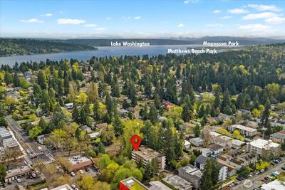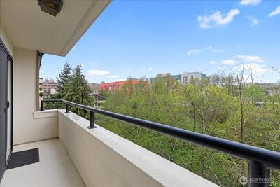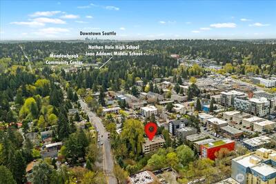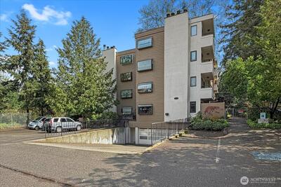 Wake up to serene treetop views in this light-filled 2-bed, 1.75-bath top floor corner unit condo, quietly perched above a lush green canopy with Thornton Creek flowing below. This upper level home offers a fantastic, open flow with an inviting living and dining area anchored by a cozy wood-burning brick fireplace—perfect for everyday living or entertaining. Step onto your private deck to enjoy peaceful mornings surrounded by nature. Recently refreshed with new paint and modern light fixtures, plus beautifully updated bathrooms, this move-in ready home truly shines. The spacious primary suite features an attached full bath and generous closet space, complemented by a dedicated storage unit for added convenience. Pre-inspected for peace of mind, with a strong, well-run HOA covering water, sewer, garbage, and basic cable. Additional highlights include secured garage parking, elevator access, and a private lobby entrance. Ideally located in vibrant Lake City—just blocks to shops