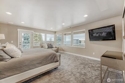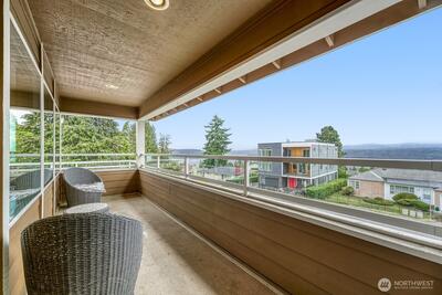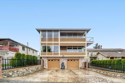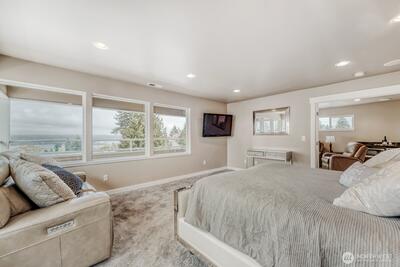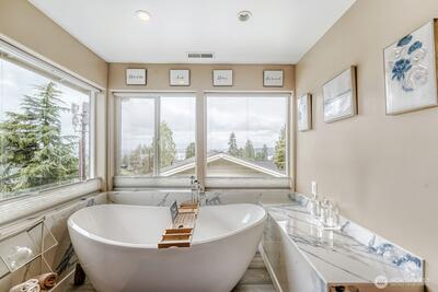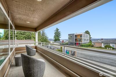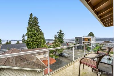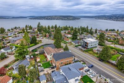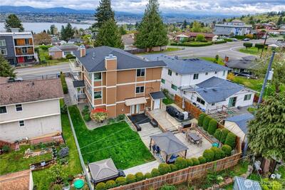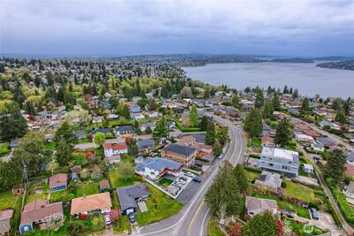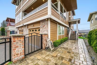 Perched above Lake Washington in Seattle's coveted Lakeridge enclave, this distinguished residence does not merely offer views, it orchestrates them. Panoramas of Lake Washington, Mercer Island, Seattle skyline, and snow-capped Cascades unfold from virtually every room across three masterfully designed levels. Wrought iron and brick frame your arrival. A private elevator serves all three floors. The open-concept main level delivers a chef's kitchen with granite counters, full glass tile backsplash, and stainless appliances, anchored by a fireplace living room and formal dining all wrapped in floor-to-ceiling glass that makes the view the permanent centerpiece. Reserve the entire upper floor for yourself. The penthouse primary suite features a dedicated lounge, French door office, two private balconies overlooking the Seattle skyline and lake, a bedroom-sized walk-in closet, and spa bath with jetted soaking tub, steam shower, and double vanity. A sanctuary without compromise. The low