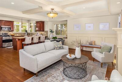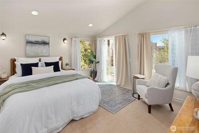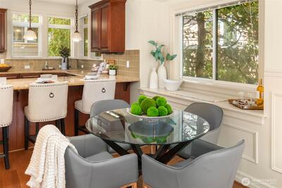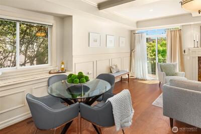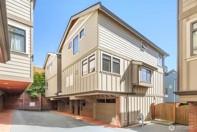 Beautifully located between everything Uptown & Upper Queen Anne have to offer, this end-unit townhome sits in a charming Craftsman-style community w/ easy access to dining, arts, & entertainment. The entry level of the home features a full bedroom w/ en-suite bath & direct access to a private backyard—perfect for summer BBQs or relaxing outdoors. An attached garage provides secure parking & everyday convenience. The main level upstairs offers a spacious living & dining area with an open layout, along w/ a well-appointed, expansive kitchen featuring quality stainless steel appliances, including a gas range. A powder room/guest bathroom is also conveniently located on this level, along w/ a cute patio where you can enjoy views of lush trees. Thoughtful details like stacked crown molding & wainscoting add timeless character, creating a warm, inviting atmosphere. Top floor, the primary suite includes a private patio with lovely city light views at night, walk-in closet & an en-suite bat
