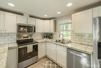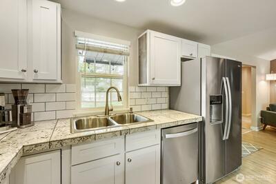 Clean and well-maintained one-story home with 3 big bedrooms and 2 full bathrooms. Primary suite has a private bathroom and walk-in closet. Bright & open kitchen has been updated with white cabinets, granite countertops and stainless-steel appliances, both bathrooms have been updated too. Stylish LVP flooring. New roof and fresh exterior paint. large two car garage and extra parking out front. Fully fenced backyard has a party sized patio for summer BBQs and a shed for storage, yard equipment or? The Cherokee Bay Community has a private lakefront beach park that features a boat launch (no internal combustion engines), a fishing and swimming dock and a beach plus a playground and clubhouse. Coveted Tahoma School District. Convenient location is close to schools, shopping and restaurants.