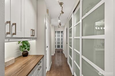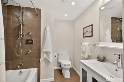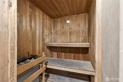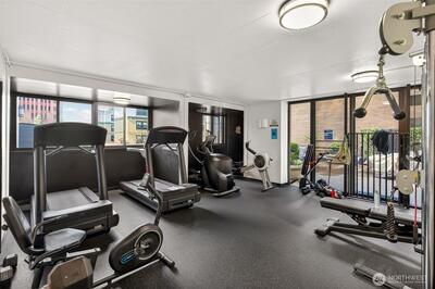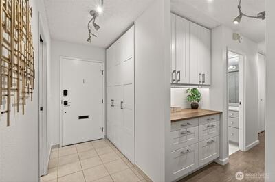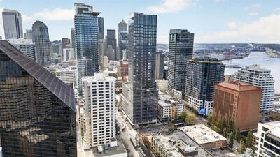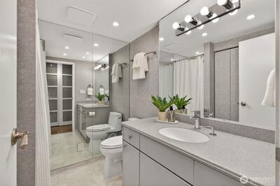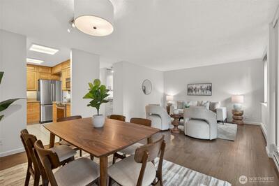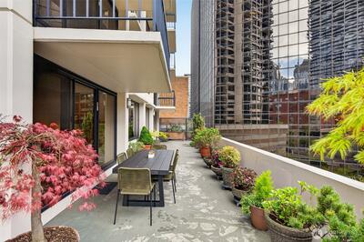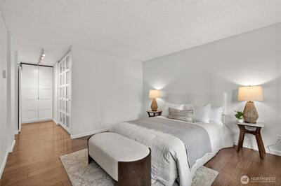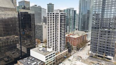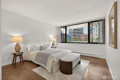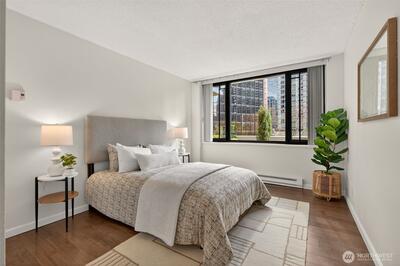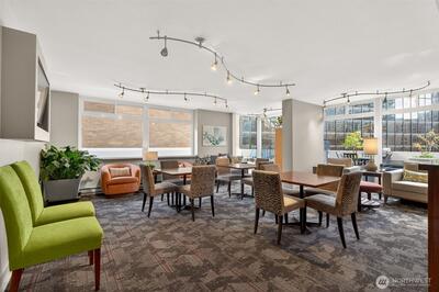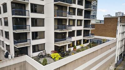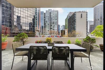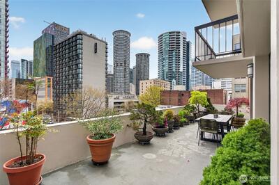 Welcome home to a rare retreat in the heart of Belltown! This thoughtfully updated 2 bed, 2 bath, 1300 sq ft condo at the Royal Crest lives unlike anything else in the building, anchored by a private 20ft x 80 ft patio that opens to a quiet, protected courtyard, a layout that is perfect for summer entertaining. Inside you'll find fresh flooring, updated bathrooms, refreshed appliances, and generous storage with built-in organization systems throughout. In-unit washer and dryer, plus a dedicated 6'x6'x8' assigned storage unit for everything else. Ownership at Royal Crest is genuinely turnkey. HOA dues cover all utilities (electricity, heat, water, sewage, garbage), and the building has no pending special assessments. Building amenities include an outdoor pool, sauna, fitness center, community room, BBQ area, and on-site manager. Park with confidence in your deeded garage stall, complete with a free, unmetered 20 amp EV charging outlet. With a walk score of 99, a transit score of 100, yo