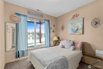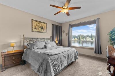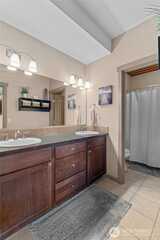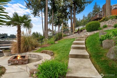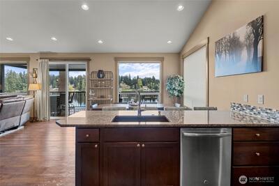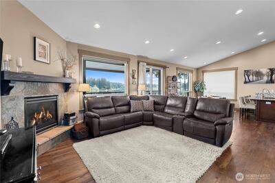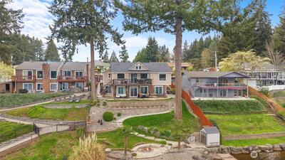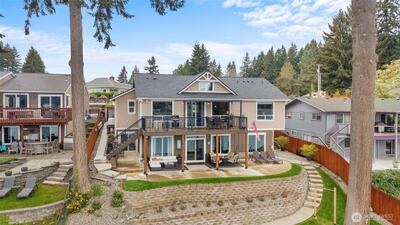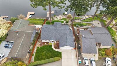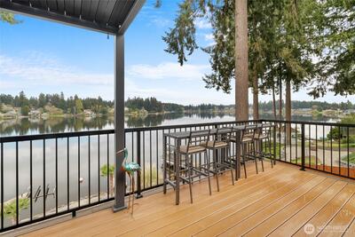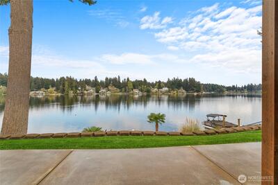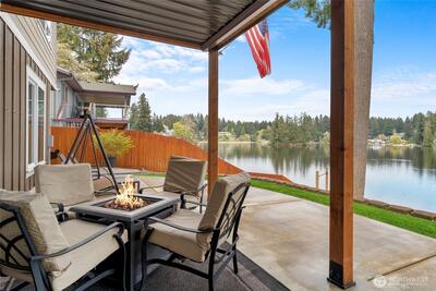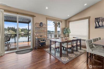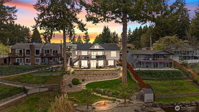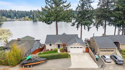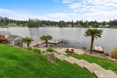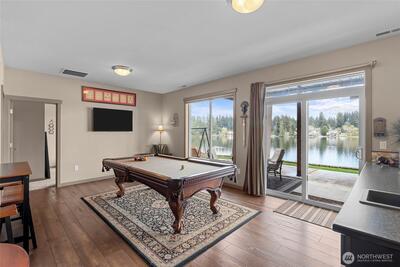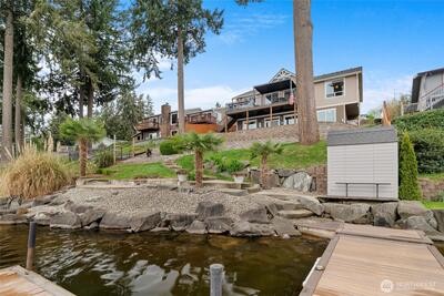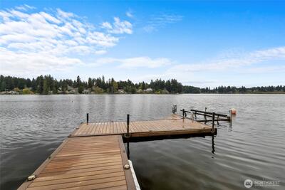 Custom-built Long Lake waterfront home offering an exceptional blend of luxury, space, and true Pacific Northwest lake living. This 3 bed, 3 bath residence with a versatile floor plan that features a dedicated office, den, media room, family/game room, and pool room—perfect for entertaining, remote work, or multi-generational living. It showcases vaulted ceilings, expansive windows capturing stunning lake views, and high-end finishes throughout including beautiful hard-surfaces and hardwood flooring and a warm gas fireplace. Main level offers excellent potential for guest or MIL setup with nearby bath and no-stair access. Enjoy seamless indoor-outdoor living with a covered deck and patio overlooking the water—ideal for year-round relaxation and hosting. A gently sloped path leads to your private waterfront retreat featuring a solid bulkhead, dock, boat lift, and jet ski pad for effortless lake access. Spend your days wake surfing, skiing, kayaking, swimming, or fishing from your o