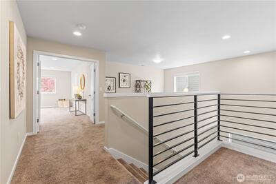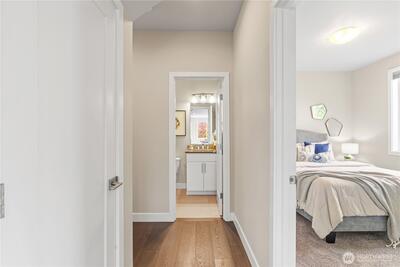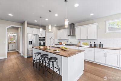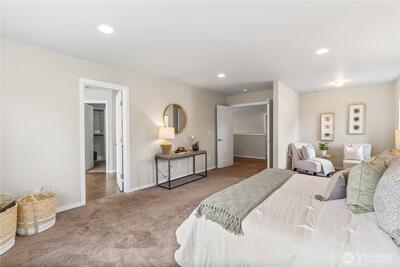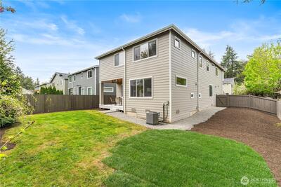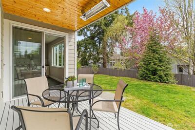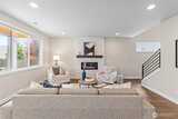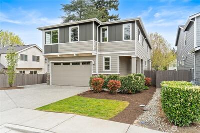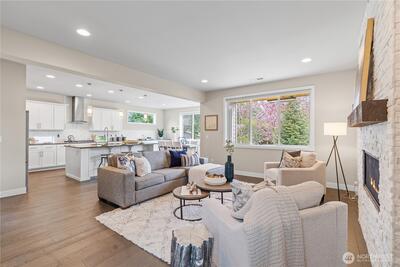 Contemporary like-new, beautifully designed home offers seamless living. The heart of the home is the spacious great room with a stacked stone accent fireplace, bathed in light with sliding doors to the rear deck and substantial yard. The chef’s kitchen features a large center island with quartz slab counters, a walk-in pantry and dining room lined with a built-in buffet. The flowing floor plan offers a main floor bedroom and bathroom as a perfect guest retreat. The upper floor includes the sumptuous primary suite with a sitting area, a generous customized walk-in closet and a luxurious spa bath with a walk-in shower and soaking tub, fit for a queen. Three guest suites, a play room/media center, open foyer for flexible spaces/office complete the upper floor. Enjoy year round entertaining on the covered patio overlooking the level, grassy backyard. A considerable driveway allows for ample parking in addition to an oversized two car garage. Minutes to downtown Bothell’s upscale resta