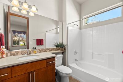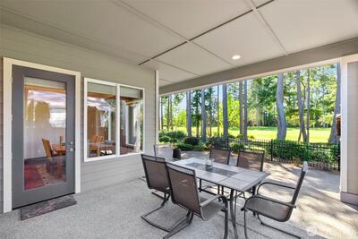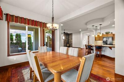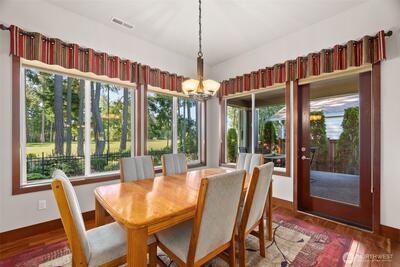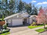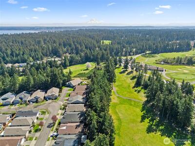 Nestled up to The Golf Club at Hawks Prairie and overlooking hole 10, this customized home offers all the upgrades. Picturesque views of the golf course are enjoyed from your covered back patio and beautifully landscaped yard. Tiled entry leads you into the home across engineered hardwoods into a well-lit home where you can see golf course views from almost every room. Cozy gas fireplace for those chilly nights and A/C for upcoming summer months. Bonus room/office space with french doors give added living space. Customized kitchen w HUGE island for all to sit around and enjoy. Generously sized laundry room with added counter space, built in workspace and lots of storage. Owners had a 4-foot garage extension so there is room for projects/tools. Primary suite offers large walk-in closet, dual sinks, vanity area, walk-in shower, private toilet and soaking tub. Guest room has full bath, so your guests have added privacy. Come enjoy all that Jubilee has to offer from endless acti