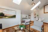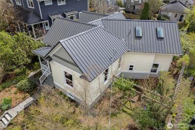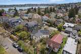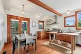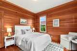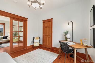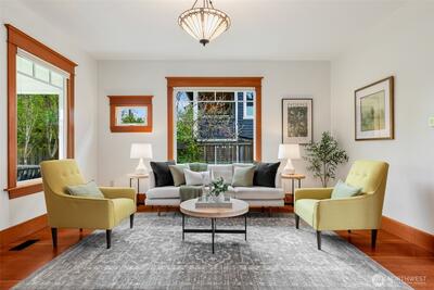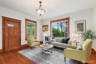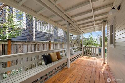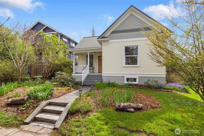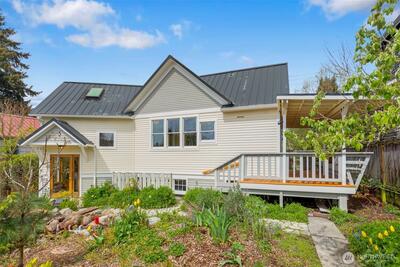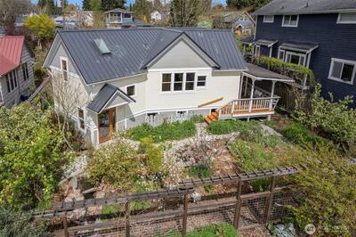 Tucked away on a lovely tree lined street in the heart of Phinney Ridge is a home that feels worlds away. A charming vintage farm house with modern updates on an exceptionally large, wide lot surrounded by gardens and fruit trees with a welcoming front porch. Step inside to find remarkably high ceilings, wood floors, abundant Fir millwork, and a unique floor plan that offers true flexibility. The front bedroom is warm and cozy with wood walls and abundant light. The middle bedroom with French doors is a wonderful flex space that can be used as an office, den, guest room or even a formal dining room. The spacious kitchen is the heart of the home, with cherry cabinets, new countertops, and sunny southern facing windows that look out into the enchanting garden and fill the home with natural light. Just outside the kitchen is a large covered deck that is perfect for year-round entertaining. The Primary is a full suite in its own wing of the home with another entrance from the garden, an im