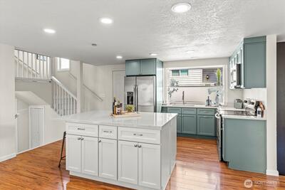 Tucked in the heart of West Seattle, this inviting home showcases a unique multi level layout and clear pride of ownership. The main level connects the living, dining, and kitchen areas in an easy flowing great room design, with a deck just off the dining area. The kitchen has been completely remodeled and features upgraded quartz counters. A few steps down, the family room creates a separate hangout space to relax or entertain, along with a convenient half bath/laundry area. The entire upper level is dedicated to the spacious primary suite featuring a large walk-in closet plus an additional closet, a full bath and private deck retreat. The lower level includes two bedrooms with oversized walk-in closets, a 3/4 bath, and flex space perfect for an office, media room, or play area. The crawlspace has been concreted. Alley access leads to the backyard with a large paved area ideal for parking or patio use and a firepit great for enjoying evenings outside with a French drain added that als