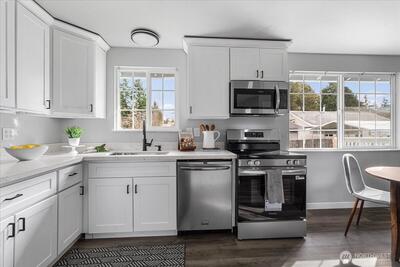 Enjoy easy living in this beautifully refreshed home featuring a bright, open layout and thoughtful updates throughout. This 5-bedroom, 2-bathroom property offers inviting living spaces with updated flooring, abundant natural light, and a seamless flow between the living, dining, and kitchen areas. The kitchen has been updated with crisp white cabinetry, solid surface countertops, stainless steel appliances, and a clean, modern look that makes the space feel both functional and welcoming. Large windows in the main living areas bring in great natural light, while the layout offers flexibility for both everyday living and entertainment. The home also includes a spacious lower-level bonus area, ideal for a second living space, media room, home office, or playroom. Both bathrooms have been refreshed, including a full bath with subway tile surround. A dedicated laundry room adds convenience, while the attached garage provides additional storage and parking. Step outside to enjoy the large,
