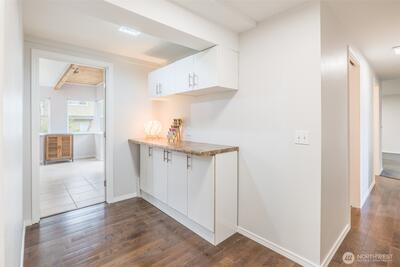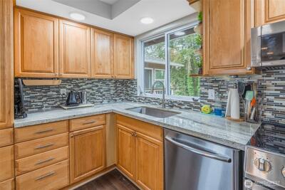 Tucked into a quiet Renton neighborhood, this home offers a rare balance of comfort and functionality. Oversized windows allow natural light to fill the main living spaces, creating a warm and inviting atmosphere from the moment you step inside. The layout flows effortlessly btwn the kitchen, dining, and living areas, making it as practical as it is welcoming. The kitchen features granite countertops, real oak cabinets, SS appliances, and hardwood floors, with access to the deck, creating a seamless connection between indoor and outdoor living. The primary suite also offers a private deck along with a beautiful bathroom. Updates throughout give the home a clean, cohesive feel while still allowing room to make it your own. Downstairs, the home opens up even further with studio space, bonus room, additional bedroom, and a kitchenette that is already plumbed and ready for a second kitchen, offering flexibility for guests, multi generational living, or additional use. Step outside and the
