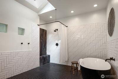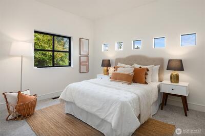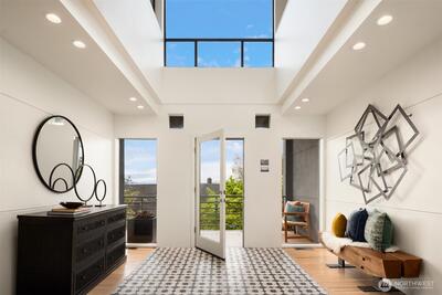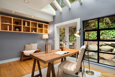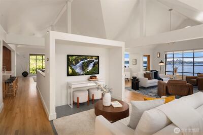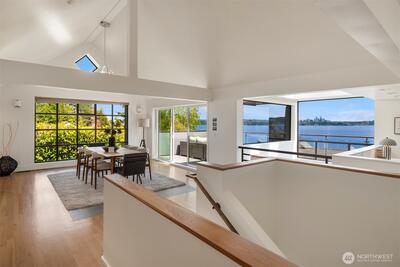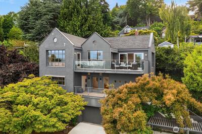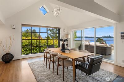 This exceptional architectural view home is a true showpiece for those who appreciate modern design and unforgettable scenery. Defined by dramatic lines, soaring lofted ceilings, and walls of picture windows, the home is designed to fully capture its breathtaking, unobstructed views of Lake Washington, the city skyline, and the surrounding mountains. An open concept layout is bathed in natural light, with expansive living spaces enhanced by skylights and striking architectural details that create both scale and warmth. Nearly every room is oriented to the view, creating a constant connection to the stunning natural backdrop. The primary suite is a luxurious retreat, complete with a spa-inspired five-piece ensuite bath. The chef’s kitchen features rich walnut cabinetry and premium Miele appliances, seamlessly blending function and design for both everyday living and entertaining. Step out onto the view deck to take in sweeping panoramas, whether enjoying quiet mornings or hosting unfo