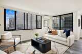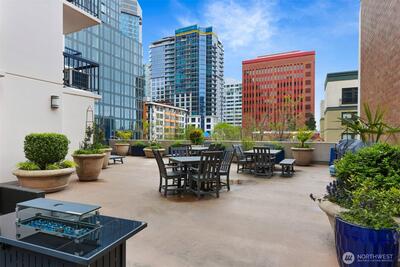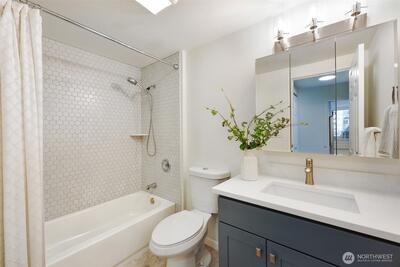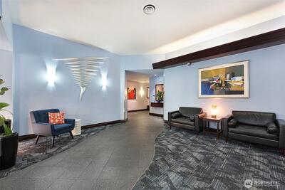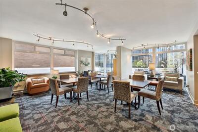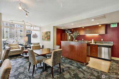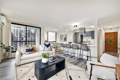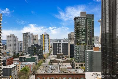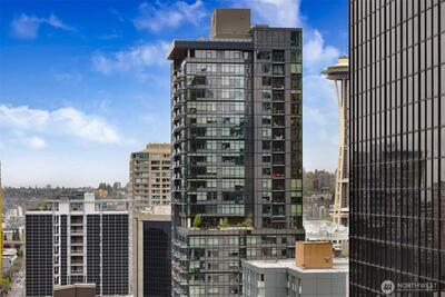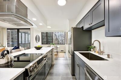 Fully renovated, close to all your favorite spots, with a water view - for under $400k?! Yes, and it can be yours! Perched 18 floors above the vibrant streets of Belltown, this corner unit takes the cake for being both stylish & livable without giving up affordability. Large windows frame fantastic views of Elliott Bay, the majestic Olympic Mtns, Bainbridge Island & stunning summer sunsets for quintessential Seattle vibes that never get old. Move in & be the first to break in this newly refreshed space: new flooring, newer windows, no popcorn ceilings, new bathroom vanity/fixtures/tile surround, all-new lighting, & an opened-up kitchen complete w/ quartz counters, quality wood dovetailed cabinetry, a roomy peninsula with bar seats & all-new fridge, dishwasher, range & powerful hood. Large east to northwest windows keep the space bright while mini-splits provide both heat & A/C to keep you comfortable. Fall asleep to sparkling city lights & the gentle glow of the Space Needle (viewed fr