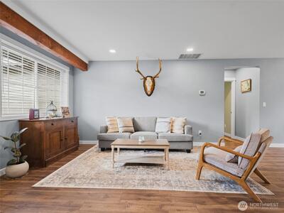 Come see this beautifully updated home just minutes from I-5, offering the perfect blend of convenience and peaceful country living. Set on 1+ acres, this property provides privacy and space to enjoy the outdoors. Extensive recent updates include new Pergo XP flooring throughout, all new interior trim, fresh interior and exterior paint, updated lighting, and remodeled bedrooms and bathrooms. The home features exposed beams in the living and dining areas, adding warmth and character, along with a beautifully updated kitchen with hickory cabinets and quartz countertops. Enjoy the flexibility of multiple living spaces, including a welcoming front living room and an additional living area—perfect for relaxing or creating separate spaces for everyday living. Stay comfortable year-round with A/C and take advantage of the outdoor space featuring a fire pit area and a covered BBQ area for year-round use. A detached shop offers excellent space for storage, hobbies, or projects, while the a