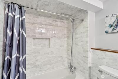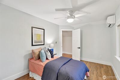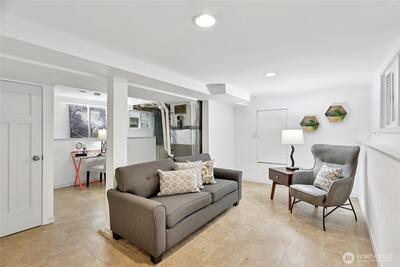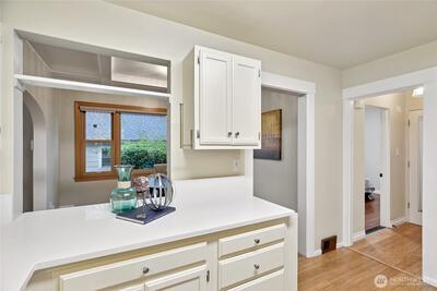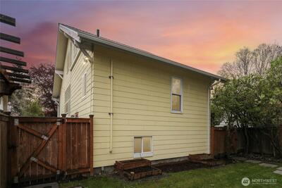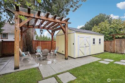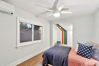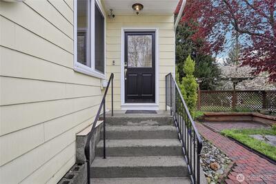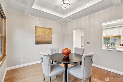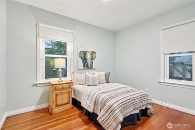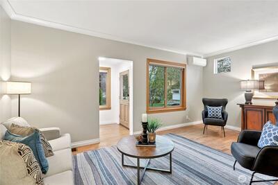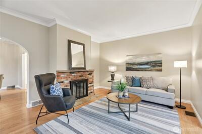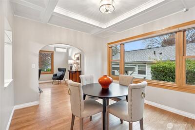 Welcome to this beautifully updated Green Lake Craftsman, where timeless architecture meets thoughtful modern upgrades. Bathed in natural light, this home showcases classic period details, including soaring 11-foot ceilings, elegant archways, rich hardwood floors, and stunning box beam ceilings that anchor the formal dining room with warmth and character. The main level offers a seamless blend of old and new, featuring an open, inviting kitchen with stainless steel appliances, updated countertops, and ample workspace—perfect for both everyday living and entertaining. Bathrooms have been tastefully renovated with quality finishes, while the remodeled lower level provides flexible living space ideal for a media room, home office, or guest accommodations. Major system updates include a new roof, energy-efficient triple-pane windows, and a new mini-split HVAC system for efficient year-round comfort. Enjoy peek-a-boo mountain views and step outside to a private backyard retreat featuring