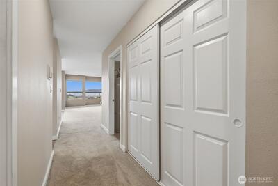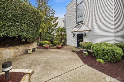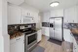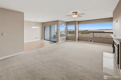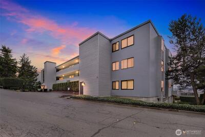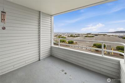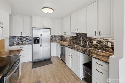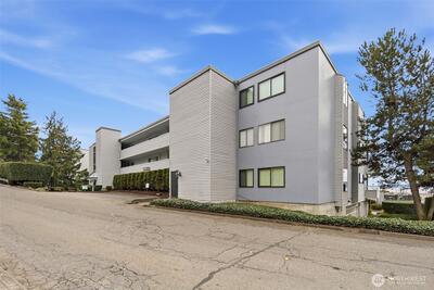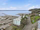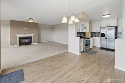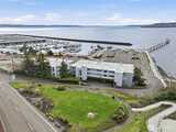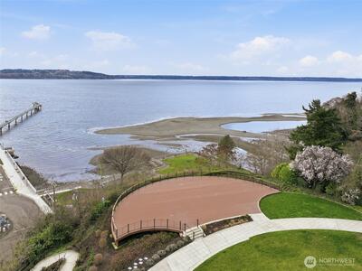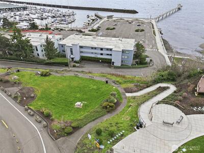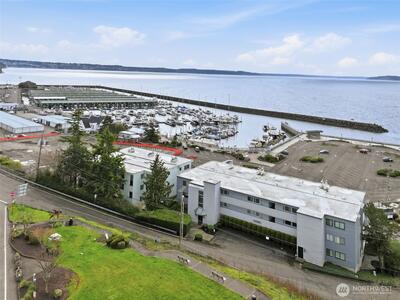 180° Views of the Puget Sound and the Olympic Mountains define this exceptional one-level waterfront condo, steps from the Des Moines Marina and Des Moines Beach Park. Front-row seat to sailboat races from the nearby yacht club and spectacular sunsets over the Sound and Olympics from your private view deck. Spacious floor plan features an open living area with fireplace and expansive windows designed to showcase the water and mountain views. Kitchen is finished with crisp white millwork, rich granite countertops, mosaic tile backsplash, stainless steel appliances, double-basin sink, and abundant cabinet storage. Primary suite with a full bathroom with jetted tub and walk-in closet with organizer. Additional bedroom and full guest bathroom and in unit laundry (W/D stay!) .Secure building with elevator access and no stairs required to reach the unit. Two covered garage parking spaces plus abundant guest parking available at the adjacent park. Highly walkable location near the marina,