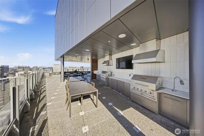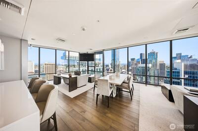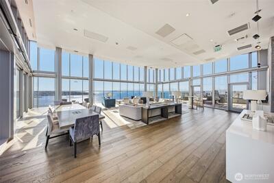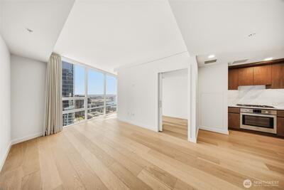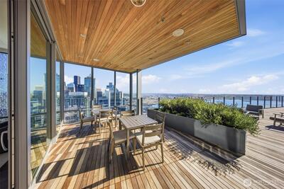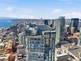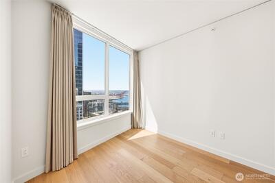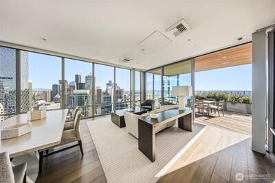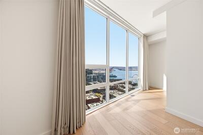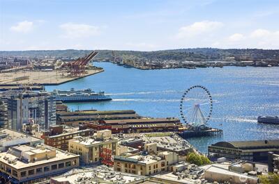 Perched high up on the 18th floor with an incredible vantage point of Seattle's world-famous landmarks, experience the true essence of downtown living. Reside to your living room and be greeted by an unparalleled cityscape, featuring expansive views of the best Seattle has to offer. Pike Place Market, The Great Wheel, and Elliott Bay are all on grand display right from home, and simply a block away to visit in-person. Built in 2021 with modern finishes around every corner, this space has everything you could want for thoughtful urban living - main bedroom sharing the same coveted view, spacious kitchen with gas stove + Bosch appliances + quartz counters + soft-close modern cabinets, and a private office space for the moments you need to slow down from the city bustle. Convenience shines, as resident amenities include 24/7 concierge, fitness/gym, dog play area + dog wash, top floor community lounge with WiFi + event kitchen, rooftop patio, indoor/outdoor entertaining space, and so much
