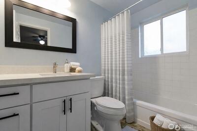 Fully remodeled home in the heart of Kent on a quiet cul-de-sac. Seamless open concept floor plan from living to dining with sliding glass doors onto large, covered deck for year-round enjoyment. Home features 5 bed, 2.5 baths including primary on main floor w/ own private full bath. Upstairs boasts good sized bedrooms and one impressively spacious versatile bonus room. Enjoy beautiful modern baths and kitchen with quartz countertops and SS appliances. Cozy around the fireplace in your living room. Huge windows gives home lots of natural sun light. Love the oversized fully fenced back yard with plenty of space to play, garden, or relax and entertain. Don’t miss multiple sheds for all your tools and projects. Newly installed roof! Extra long drive way for multiple vehicles and oversized cars/boats or RV. Move In Ready! Prime location! Easy access/min to freeway, Kent center, shopping, parks and other amenities. Welcome Home!