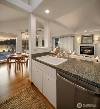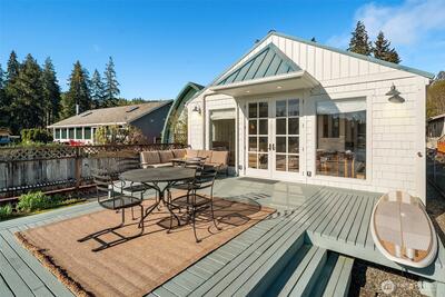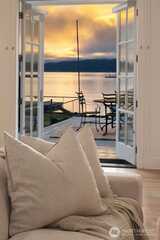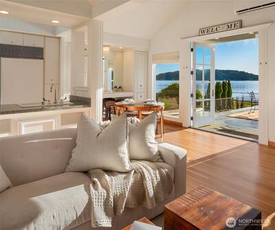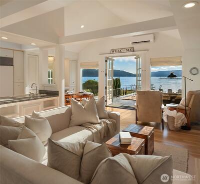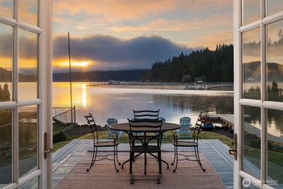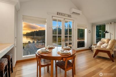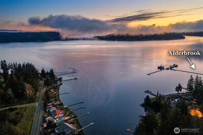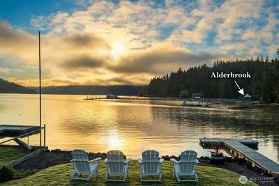 Legacy, low-bank waterfront, sun-filled rambler mere steps to Alderbrook Resort, sleeping 6+ privately with oysters/clams on your own private tidelands! Coveted, rarely available location, highly walkable to restaurants, live entertainment, spa, shopping, marina, mooring, miles of hiking trails, and short drive to golf, boat launch, and Olympic National Park. Front row seats to Alderbrook’s firework displays, parades, summertime swimmable saltwater, and abundant wildlife. Professionally designed, bright and open, the home lives unexpectedly large. Three private sleeping areas, 2 bathrooms, soaring vaulted ceilings, skylights, and up-lighting in the beams cast a glow at night. Refinished, solid, wide-plank hardwoods, a Sub-Zero, European appliances, a/c, laundry room, and ample pantry storage. After hiking, relax in the jetted soaking tub, cuddle in front of the warm fireplace, witness epic sunrises, seals, eagles, and osprey in awe as they chase spawning salmon in the fall. Outside,