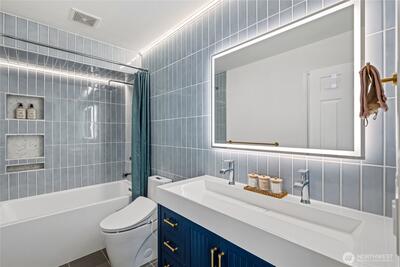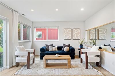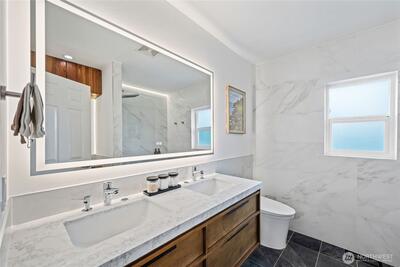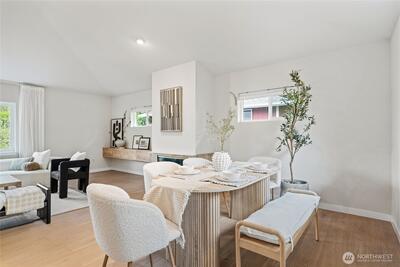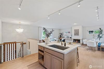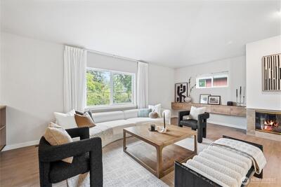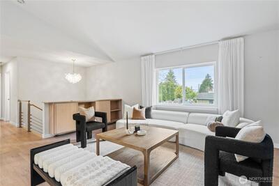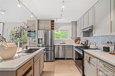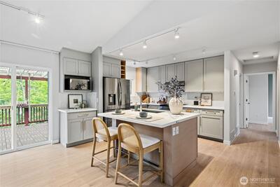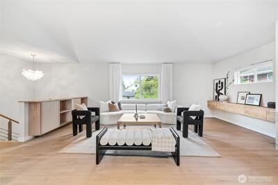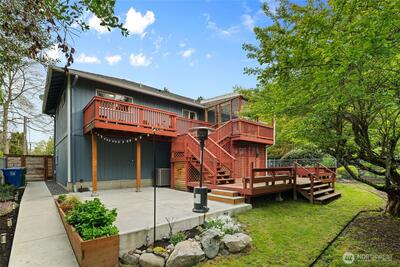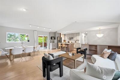 Fully remodeled 3 bed, 1.75 bath in the desirable Riverview community of West Seattle, this beautiful home is tucked away on a quiet private street bordering protected public land for rare, lasting privacy. Recently renovated with a clean, modern aesthetic including premium LVP and porcelain tile flooring, updated bathrooms, and a stylish kitchen with quartz countertops, stainless steel appliances, pull-out drawers, and a large island with bar seating. Vaulted ceilings and an open-concept main living area create a bright, spacious feel filled with natural light. Equipped with A/C and a high-efficiency heat pump—an increasingly rare and highly sought-after feature in Seattle—plus EV charger for added convenience. Attached 460 SqFt garage plus ample driveway space. Lower level features a separate entrance with strong ADU or rental potential or ideal multi-generational living. Outdoor spaces shine with expansive multi-level decks, a new large concrete patio (2024), and a new storage s