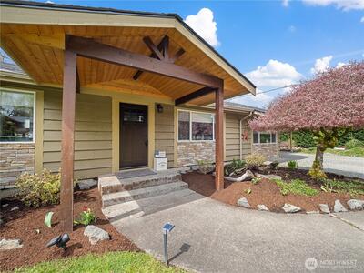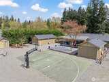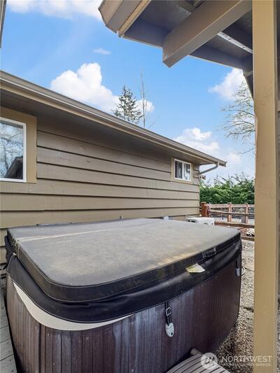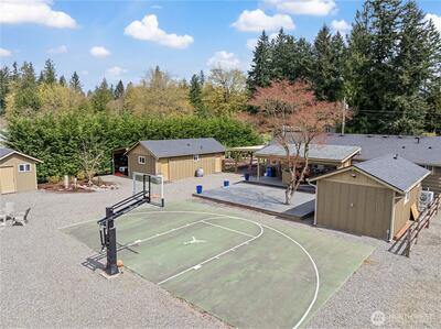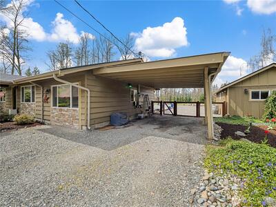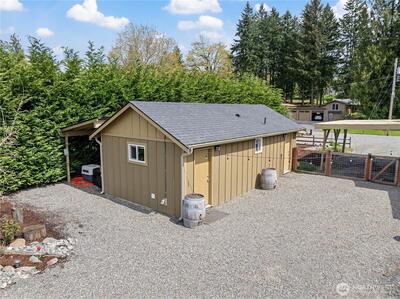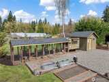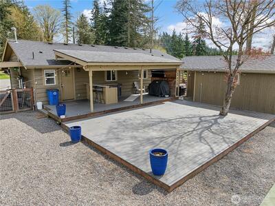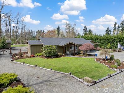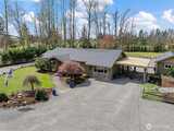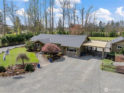 Completely renovated (from the studs out in 2019) Enumclaw rambler on a pristine 32,571SF lot w/ Mt Rainier view offering 2,020SF of living space and 3.25 total baths. Primary suite w/ custom water closet tub & shower, dual sink vanity & vaulted walk-in closet. Detached 290SF junior sweet w/ vaulted ceiling plus a detached double den/office perfect for all your work/school from home needs. Updated kitchen w/ granite countertops, island seating & GE Cafe' appliances opens to a large living room and dining room with built-ins and wet bar. All new plumbing & wiring in 2019 along with a new roof & windows. Outside you'll find 2 garden sheds, an oversized chicken coop, beautiful mature landscaping, sports court, large, covered deck w/ 1-year old hot tub included. 1-car attached carport, wired for EV charging & generator plug. Tons of extra vehicle parking with room enough for your RV. Xfinity and City of Enumclaw water. A great close-in country setting well suited for multi-generational liv