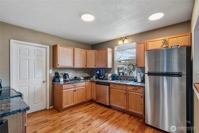 Excellent location for this craftsman style 3 bd. 1 bath home. Close to I-5, Winco, and restaurants. New stainless steel appliances, beautiful fir floors in kitchen, new laminate floors in enclosed front porch and utility/ laundry area, new remote control ceiling fans in main level bedrooms, new light fixtures, new blinds, new carpet in living room and main level bedrooms, interior painted in 2025, exterior painted in 2022. Freezer in utility/ laundry area as well as refrigerator in garage are included appliances. Pride of ownership truly shows in this home.