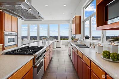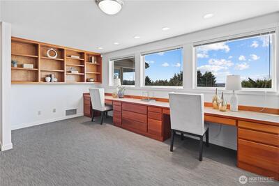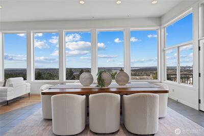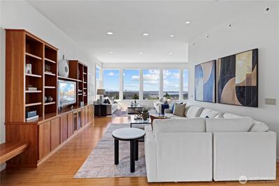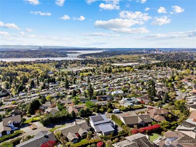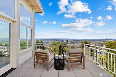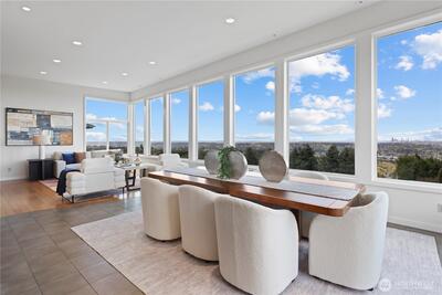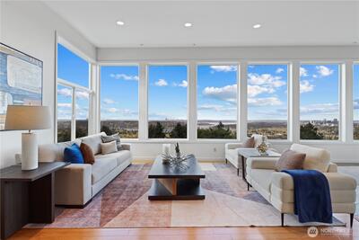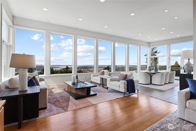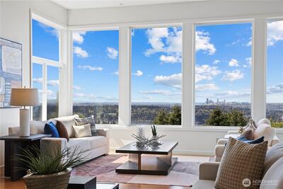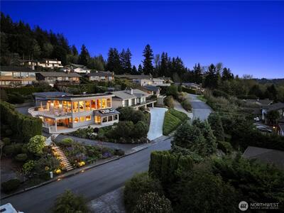 Welcome to this exceptional custom residence by premier builder Steve Kunkel, thoughtfully designed to capture breathtaking 190+ degree panoramic views. From the glittering skylines of Seattle & Bellevue to the serene beauty of Lake Washington, Puget Sound & majestic Cascade Mountains, this contemporary home offers a front-row seat to the Pacific Northwest’s finest scenery. Created for both luxurious everyday living & unforgettable entertaining, the home has graciously hosted gatherings of over 100 guests with ease. The expansive great room features soaring 12-foot ceilings & walls of windows that frame ever-changing city & water views. The spacious chef’s kitchen is equipped with stainless-steel appliances & 2 eating bars—perfect for casual meals or lively gatherings—while offering ample space for the busiest cook. 3 bedrooms and 3.5 baths, highlighted by a serene primary suite with a spa-inspired five-piece bath. A temperature-controlled wine room ensures your collection is p