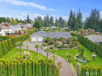 Stunning custom rambler set on an expansive 50,600 sq ft fully fenced lot, offering the perfect blend of comfort, functionality, and outdoor beauty. This spacious home features a luxurious primary suite with an oversized walk-in closet, along with thoughtful upgrades throughout including solar panels, a brand-new furnace and heat pump, tankless hot water system, and a gas generator for peace of mind during rare power outages. The well-appointed kitchen is designed for both everyday living and entertaining, featuring a huge island, double oven, and an abundance of cabinetry providing exceptional storage and workspace. Step outside to your private oasis with beautifully curated landscaping, complete with palm trees, a tranquil koi pond (with mature koi, filtration system, and maintenance equipment included), greenhouse, and abundant garden space. Enjoy a variety of established fruit trees including Bing cherry, Asian pear, peach, apple, and plum, plus thriving berry gardens with raspb