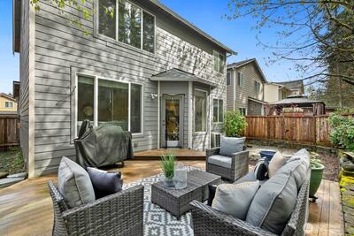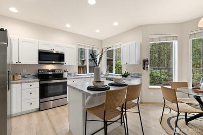 Welcome to this beautifully updated 3-bedroom, 2.5-bath home offering 1,890 sqft of thoughtfully designed living space — fully fenced and backing to tranquil green space for the privacy and serenity you've been searching for. The heart of the home shines with a brand-new kitchen featuring new cabinets and countertops plus brand new LVP flooring. Major systems have been updated for worry-free ownership: brand new roof, new central A/C, new fixtures, and a 2022 water heater — nothing left to do but move in. Upstairs, retreat to the spacious primary suite featuring a private 5-piece en-suite bath and a generous walk-in closet. Two additional guest bedrooms and a full guest bath complete the upper level. The main floor is equally functional with a dedicated home office, a convenient half bath, gas fireplace and laundry room. The 2-car garage adds even more utility and storage space. Located in a prime spot close to Lake Wilderness Elementary School, Lake Wilderness Park, popular shoppi