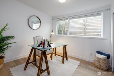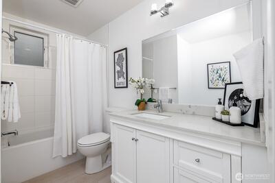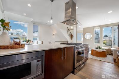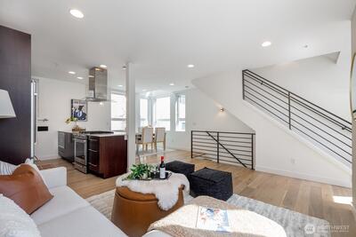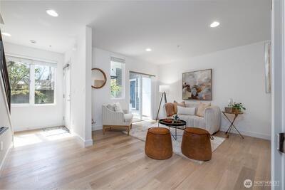 Gorgeous move-in ready townhome with views to the city. PRIME LOCATION for this 2 bedroom, 2 bath townhome with air conditioning! Sunlit floorplan with multiple outdoor spaces including the large rooftop deck. Lower floor includes a bonus room and patio + bedroom + large full bath + laundry. Main floor is wide open and flooded with natural light complete with a stunning kitchen, spacious dining with two-story windows, and living area with deck. Primary suite takes up the top floor with views to the twinkling Seattle skyline and features a large bath, and closets with custom built-ins. Tankless water heater! Just in time for summer and the 4th of July, enjoy views to Lake Union, downtown Seattle and Mount Rainer. Assigned parking spot in common garage. Walkable! Less than a mile to all the fun and amenities at Green Lake and Woodland Park Zoo. Or head on down to Gas Works Park and everything Lake Union. Just 2 miles to the UW and less than 3 miles to downtown for an easy commute.