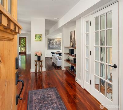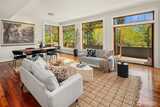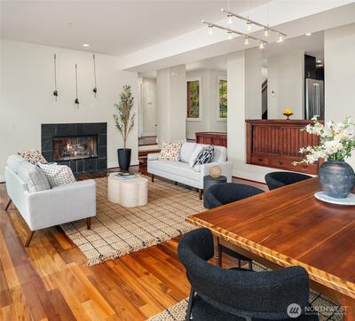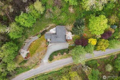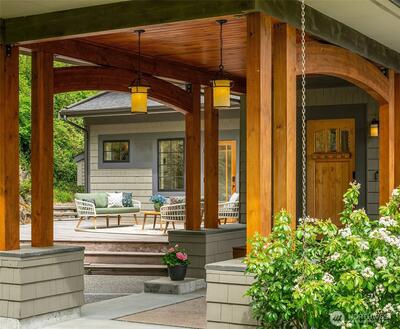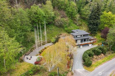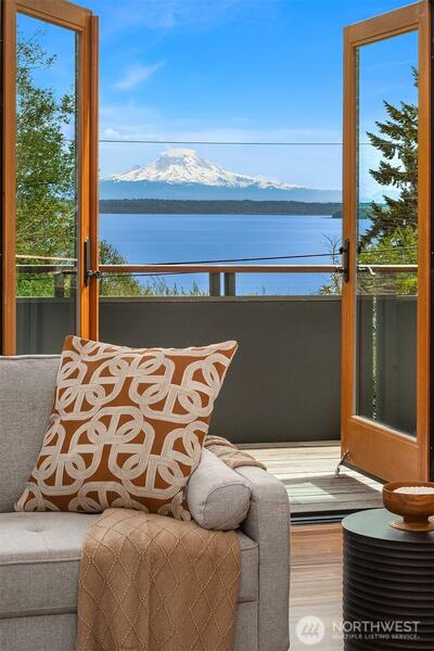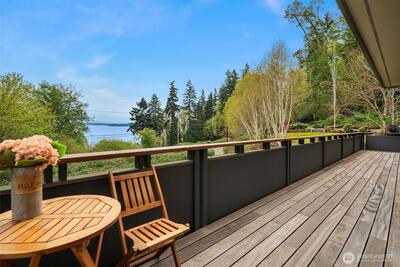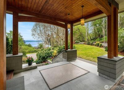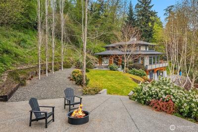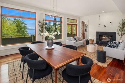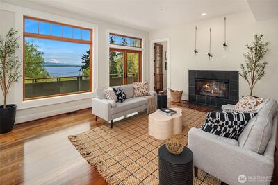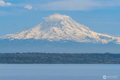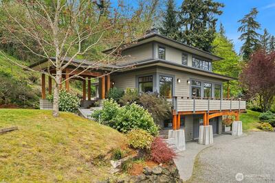 Superb living awaits in this gorgeous, architecturally engineered Northwest Contemporary residence, where a wall of windows frame sweeping views of Puget Sound, Mount Rainier, and glittering city lights. Set on a sprawling 2.6 acres, the property is a private sanctuary of perennial gardens, with a multitude of flourishing shrubs and trees. Thoughtfully designed outdoor spaces invite both quiet reflection and offer areas for vibrant entertaining. Inside, the home is a masterclass in design and craftsmanship, featuring tall ceilings, bright & airy interiors, and luxurious wood finishes, including rich tigerwood floors. Custom built-ins and elegant materials create a refined yet welcoming atmosphere, complemented by two fireplaces that add warmth and character. The flowing layout includes a stunning living room, a beautifully appointed kitchen with adjoining dining area, a cozy den/library, as well as a dedicated office. The decks extend the living experience outdoors, offering spectacula