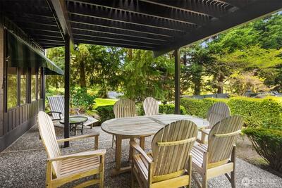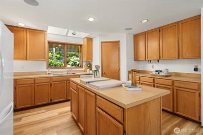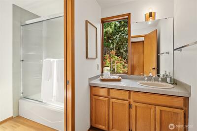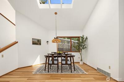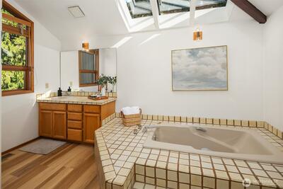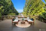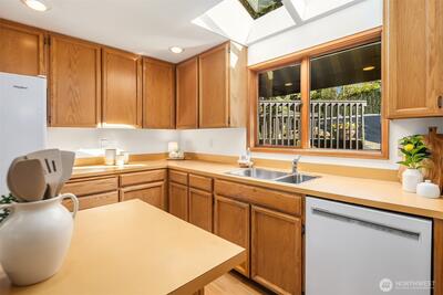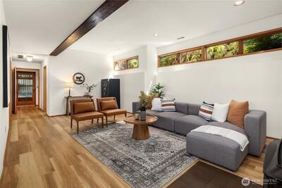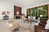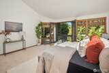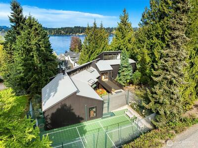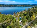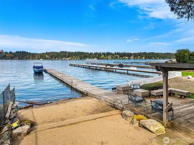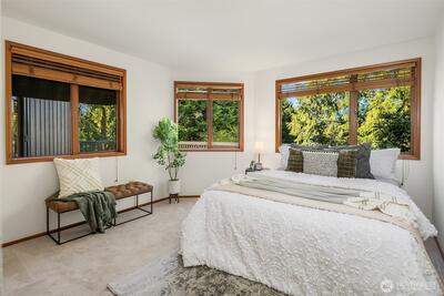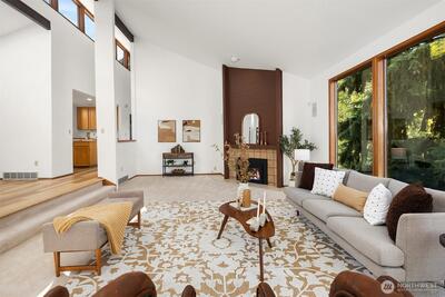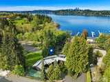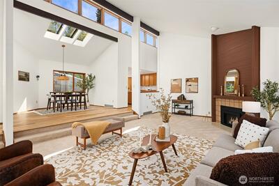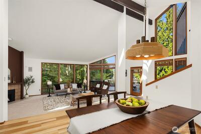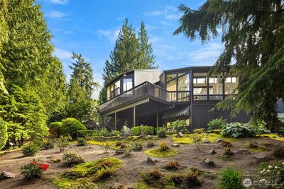 Rare shared waterfront property on N. Mercer Island. This meticulously maintained 5-bedroom, 3-bathroom home is defined by two things: exceptional natural light & stunning mature greenery that surrounds every window. Skylights, soaring vaulted ceilings, & walls of wood-framed windows flood the interior with light throughout the day, with towering evergreens as the backdrop in nearly every room. The living room, the heart of the main level — a tile-encased gas fireplace, westward-facing Lake Washington views, & direct flow to an expansive back deck w/ open sky & treetop views. The kitchen opens to a bright dinette w/ the same lush outlook. The main level also includes a formal dining room, dedicated office with direct deck access, two additional bedrooms, & full bath.The primary suite is sun-drenched, with vaulted ceilings, walk-in closet, private ensuite with skylit soaking tub, & french doors opening to a juliet balcony. A true private retreat.The lower level adds two sizeable bedro