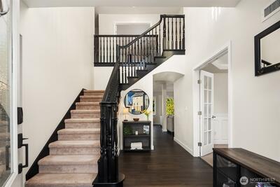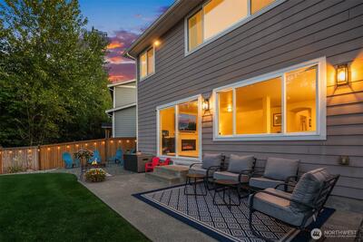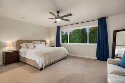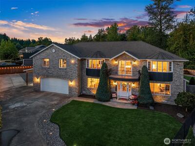 This custom-built Bonney Lake estate in the sought-after Copperfield neighborhood sits on nearly half an acre where the fully fenced backyard melts seamlessly into the Fennel Creek Trail, offering a private gate and path to bike or walk to nearby shops, Victor Falls Elementary, and beyond. The 2024 remodel elevated every corner with wide-plank LVP flooring, Sherwin Williams warm neutrals with modern black accents, a Bosch 3-zone HVAC system, keypad entry on all doors, and designer lighting throughout. The entertainer's kitchen stuns with an 8x4 island, European cabinetry, quartz counters, subway tile backsplash, touch faucet, under-cabinet lighting, and a full Bosch appliance suite. The primary suite offers parklike views, plush carpet, a soaking tub, double-head shower, granite counters, and walk-in closet. Two secondary bedrooms feature built-in desks and access to the Juliet balcony. The 864 sq ft theater room delivers 7.1 surround sound and a 132" retractable screen, with strong MI