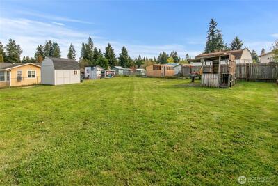 Welcome to this beautifully refreshed split-level home in the desirable Nisqually Pines community! You will immediately notice the freshly painted interior and exterior of the home. Inside, the upper level features a bright and spacious living room with vaulted ceilings, two comfortable bedrooms, and a full bathroom. The kitchen shines with newly updated countertops, and the refinished hardwood stairs add a warm, welcoming touch. Downstairs offers excellent flexibility with a third bedroom, a second full bathroom, and a bonus room perfect for a media space or home office. A large two-car garage provides ample storage, and the extended driveway offers plenty of room to park an RV. Sitting on a generous ¼-acre lot, the backyard is perfect for summer enjoyment with a Tuff Shed for storage, a fire pit, and an outdoor bar which is ideal for entertaining.Located in Nisqually Pines, residents enjoy access to a private community pool (open Memorial Day–Labor Day), clubhouse, basketball hoop