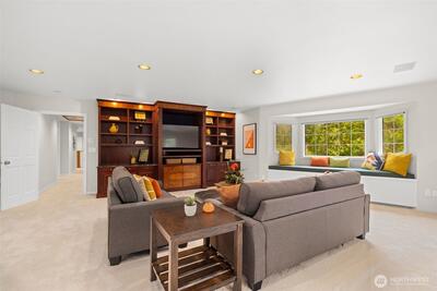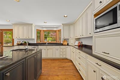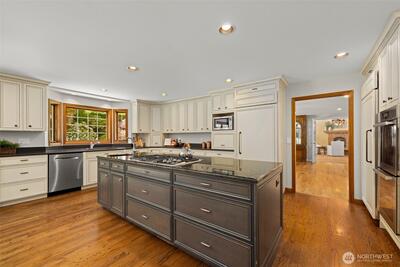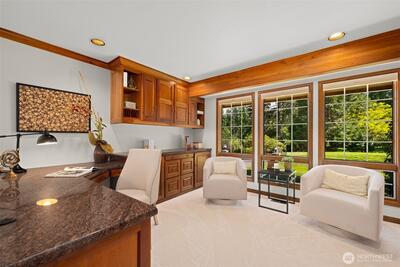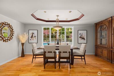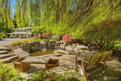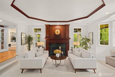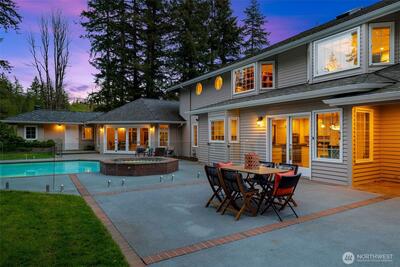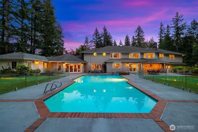 Designed around a central atrium that opens to the pool, this generous 6 acre estate unfolds across expansive interiors, a dual-island kitchen, and landscaped grounds arranged for both gathering and privacy. Mature evergreens surround the property, creating a sense of seclusion just moments from Sammamish amenities, dining, and parks. Inside, spaces are composed to support both daily rhythm and larger occasions. Living and dining areas maintain definition while remaining visually connected, allowing for easy movement between them. An intimate living room with fireplace offers a quiet setting, while the kitchen becomes a natural point of convergence, appointed with integrated appliances, custom cabinetry, and two substantial islands designed for preparation, conversation, and lingering. Light moves through the atrium, extending the interior toward the pool and shaping how the home is experienced throughout the day. Upstairs, the primary suite is set apart, oriented toward the surroundin