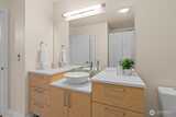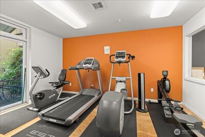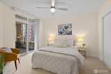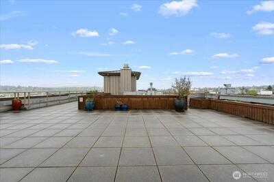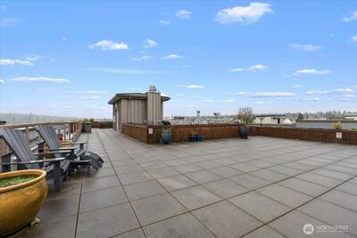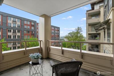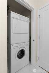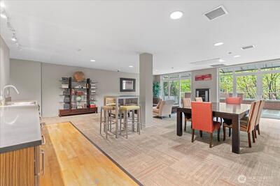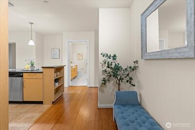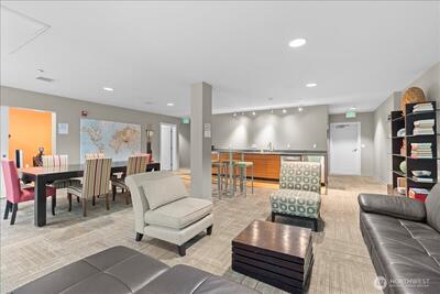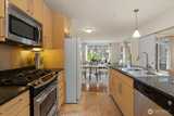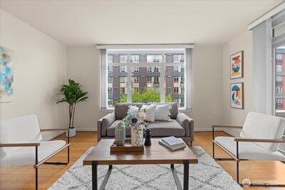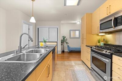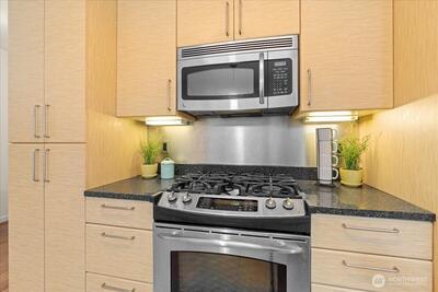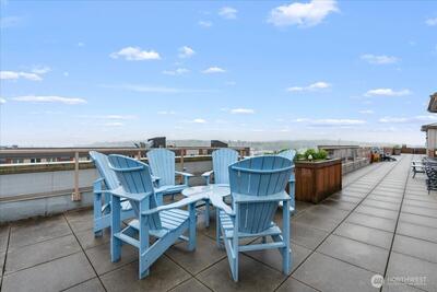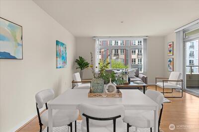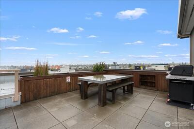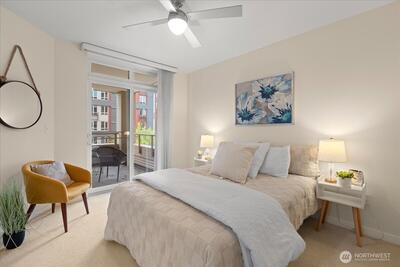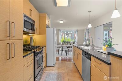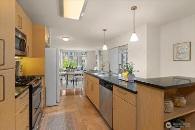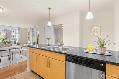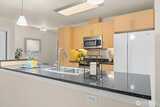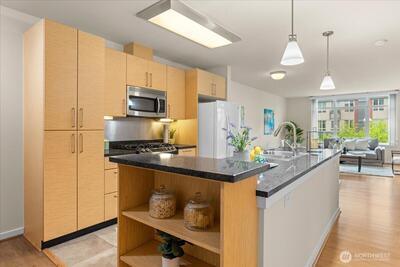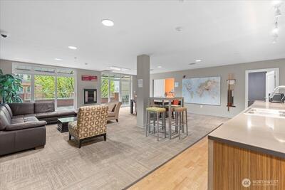 Experience elevated urban living in this light-filled 5th-floor residence at Hjärta—Ballard’s only LEED Silver certified condominium. Built with concrete and steel construction, this spacious 789 sq. ft. home offers exceptional durability, superior sound insulation, and energy efficiency rarely found in traditional wood-frame buildings. The southwest-facing layout fills the home with natural light and features an expansive living area, ideal open concept floor plan with bamboo flooring, cozy fireplace, in-unit washer/dryer, and sliding glass doors on to covered private deck for year round enjoyment. The thoughtfully designed kitchen includes granite countertops, stainless steel appliances, gas range, pantry, and tile finishes, while bathroom is accented with quartz surfaces and modern tile. Hjärta offers outstanding amenities, including a rooftop deck with P-Patch garden and BBQ, an owner’s lounge with pool table, and a fitness center—all designed to enhance everyday living.