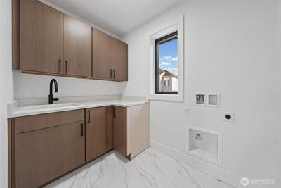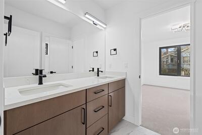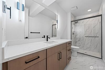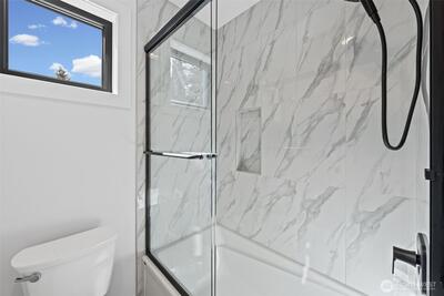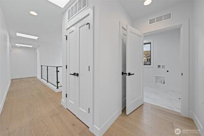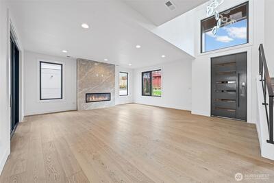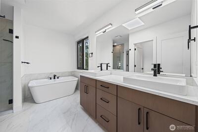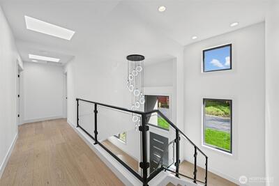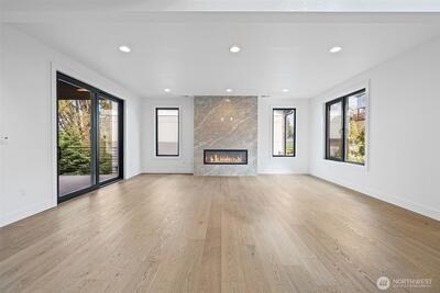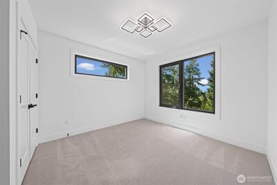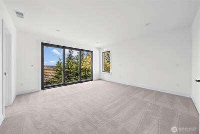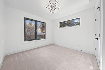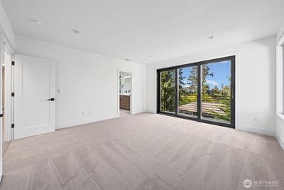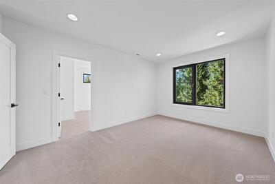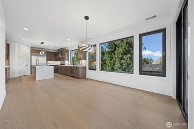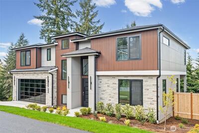 Triton Homes presents this masterfully crafted Northwest contemporary, setting a new benchmark for luxury living in Bellevue's coveted Eastgate neighborhood. Every detail has been intentionally curated — from the flowing open floor plan to the premium finishes — creating an environment that feels equally suited to quiet evenings at home and sophisticated gatherings. Floor-to-ceiling triple-pane aluminum/vinyl windows bathe the interiors in natural light while framing captivating peeks of Lake Sammamish. Beyond their visual impact, these windows deliver superior thermal performance and acoustic dampening, making this home as efficient as it is beautiful. The chef's kitchen anchors the main living space with top-of-the-line Thermador appliances and a design aesthetic that blends culinary function with gallery-worthy style. A commanding metal entry door and bold architectural detailing make an immediate impression, signaling the caliber of what lies beyond the threshold. Throughout