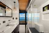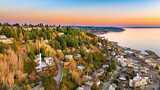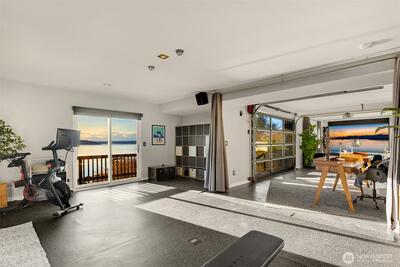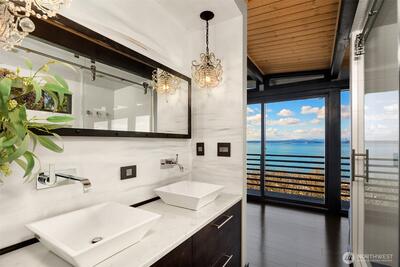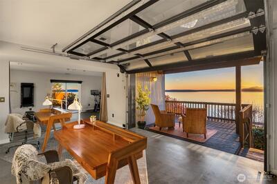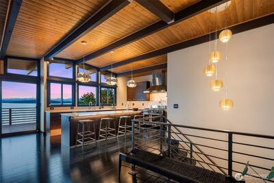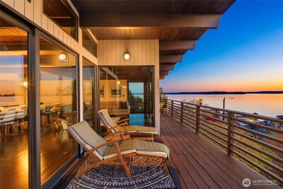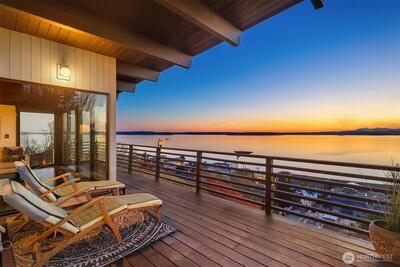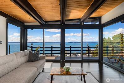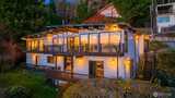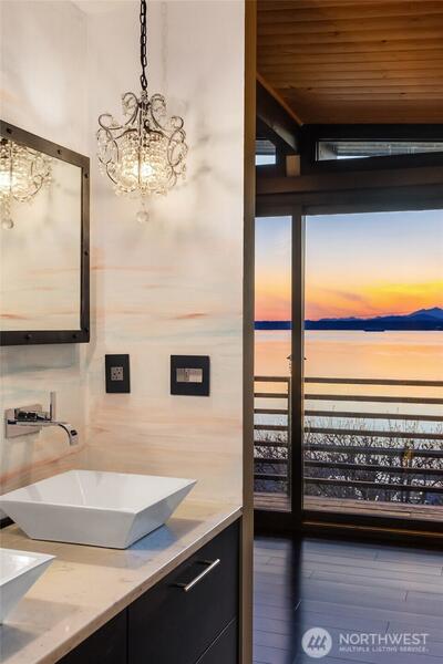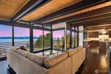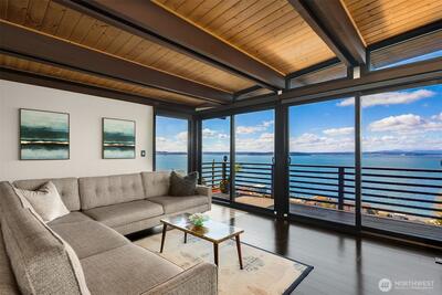 The view is the reason you’re here. Perched above Alki on a rare street-to-street lot, this reimagined mid-century modern captures sweeping 180-degree panoramas of the Olympic Mountains rising beyond Puget Sound. Floor-to-ceiling windows keep the horizon in constant focus, sunlight shifting across the water by day, ferries gliding through the Sound at dusk, sunsets that stop conversation. Thoughtfully rebuilt to preserve its architectural integrity while elevating comfort and performance, clean lines, natural materials, and open sightlines ensure the architecture never competes with the landscape—it frames it. The main living spaces flow effortlessly, designed for gatherings large or small. A chef’s kitchen anchors the home with state-of-the-art appliances. Downstairs, full-height glass opens to an expansive patio and mature landscaped grounds. Private, quiet, and sheltered. Spa-inspired baths, including a steam shower, offer a restorative retreat. Radiant heated floors, a new ro