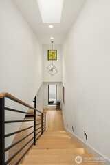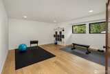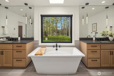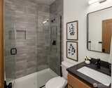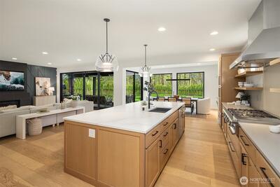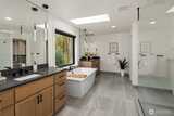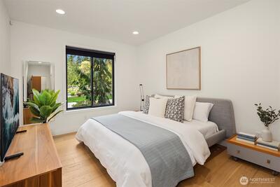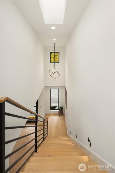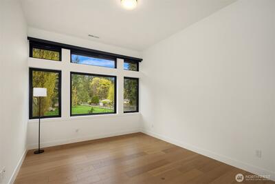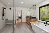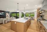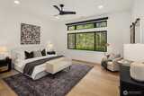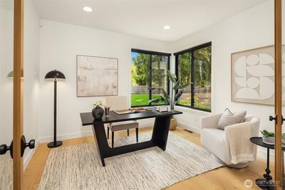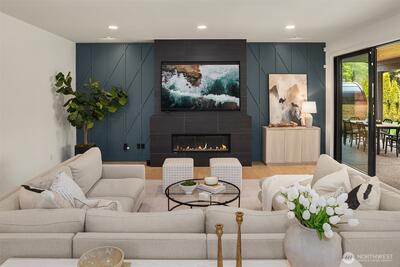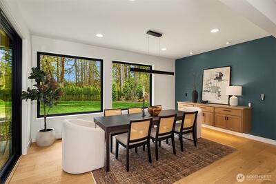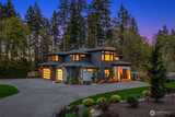 Contemporary design with a rare sense of privacy. Tucked at the end of a quiet lane and backing to a wooded greenbelt, this Woodinville residence offers a thoughtful blend of architecture, finish and livability. Light moves effortlessly through the home, highlighting clean lines, warm textures and a natural sense of flow. The main level is anchored by a beautifully composed great room with a custom millwork fireplace wall, opening to a well-appointed kitchen with quartz surfaces, custom cabinetry and premium Miele and Hestan appliances. A private den and main floor guest suite provide flexibility for work and extended stays. Upstairs, wide plank hardwoods lead to a media room and a serene primary suite with soaring ceilings and a spa-inspired bath featuring contemporary tile, an expansive walk-in shower and heated floors. Three additional bedrooms include one en suite plus a full hall bath. Outdoors, a fully fenced yard opens to natural surroundings, offering space to gather and unwind