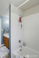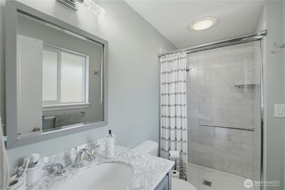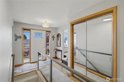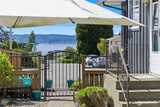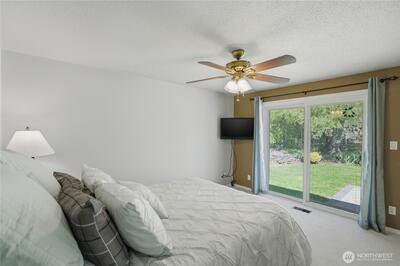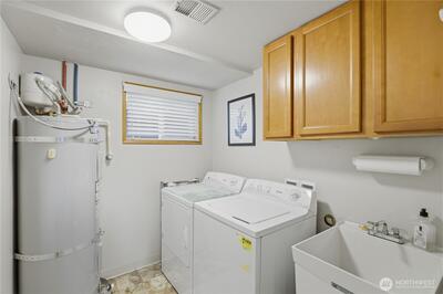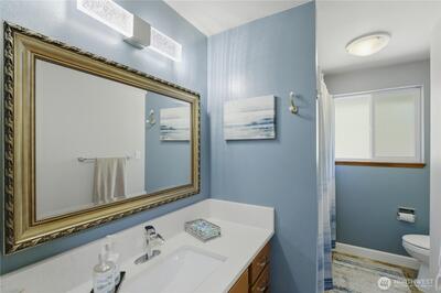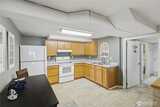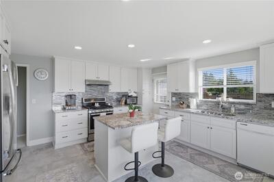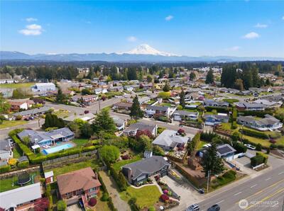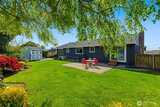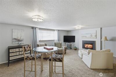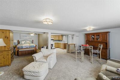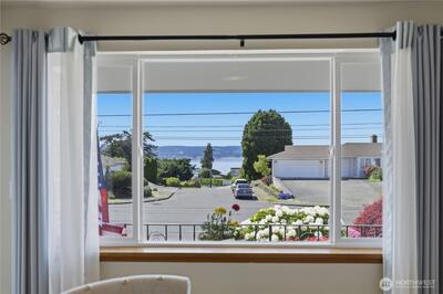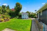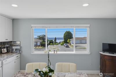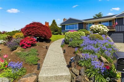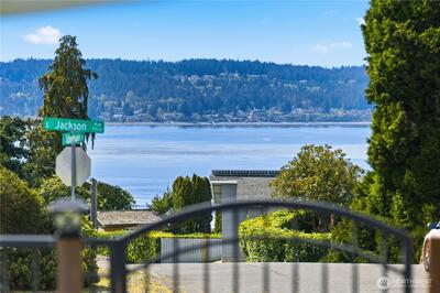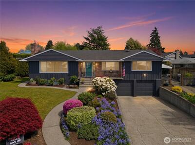 Perched on an elevated lot, this one-story home with daylight basement captures water views of the Narrows & Olympic mountain range from the main floor including the living room, dining and kitchen, filling the space with a relaxed and coastal inspired ambiance. Updated throughout with white shaker cabinets, granite countertops, refinished hardwood floors, new carpet, tile backsplash, updated lighting and a new gas fireplace insert. Bathrooms feature an updated primary shower and quartz countertop in the hall bath. The basement adds versatility with an full second kitchen and studio style living space ideal for guests, multi-generational living or ADU. Sliding doors provide access to the backyard from both the main living area and guest bedroom. Outside you will find a fully fenced yard with mature landscaping, privacy trees, a sprawling lawn, generous patio space and storage building, providing a calm, inviting outdoor retreat perfect for everyday enjoyment and gatherings. Located min