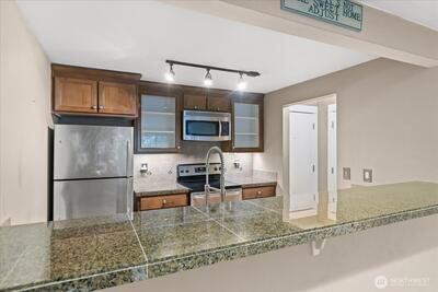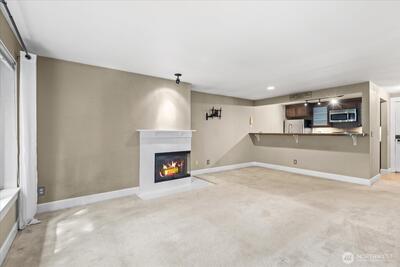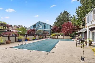 Set in the city, but tucked away in nature, the Cove at Veridian is a nearly 5 acre community of landscaped walking trails, gardens, and dedicated pet areas. This top floor corner unit is tucked away, offering incredible privacy and convenience that is rarely found in Seattle. The floor plan lives large, the open living room has a wood burning fireplace, and the kitchen has eating space at the bar and plenty of room for a separate dining space. The deck and primary bedroom are hidden in complete privacy by the tree canopy. Residents enjoy a modern clubhouse, indoor hot tub, heated outdoor pool, fitness center, yoga studio, and private access to Bitter Lake Park. Secure parking garage with the best assigned parking space available (surrounded by walls!) and plenty of guest parking. No Rental Cap, amazing community, on-site manager, bus line, and future Light Rail opening near by make this a perfect spot for just about anyone! HOA covers water, sewer, garbage, and is managed well. Don't