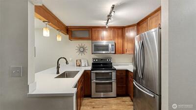 Welcome to Cascade Park Condos in Renton—an ideal opportunity for comfortable, low-maintenance living in a commuter-friendly location. This well-designed 1 bedroom, 1 bath home offers a functional layout that maximizes space and flow, making everyday living feel easy and efficient. The updated kitchen features quartz countertops, stainless steel appliances, and modern finishes that elevate the space while still feeling warm and inviting. The living area opens to a private balcony overlooking a peaceful greenspace, creating the perfect spot to relax or unwind. Enjoy the convenience of zero stair access, making entry simple and accessible, along with covered parking for added ease year-round. Located just minutes from major commuter routes including I-405 and Hwy 167, this home offers quick access to Bellevue, Seattle, and surrounding areas. Whether you’re a first-time buyer, downsizing, or looking for a smart investment, this condo checks the boxes with its thoughtful updates, great