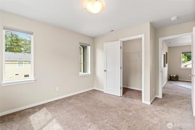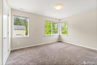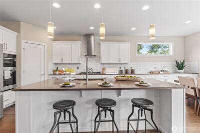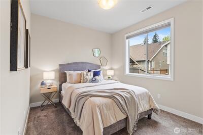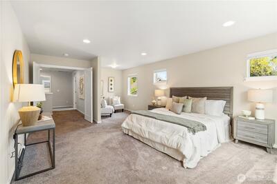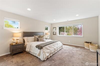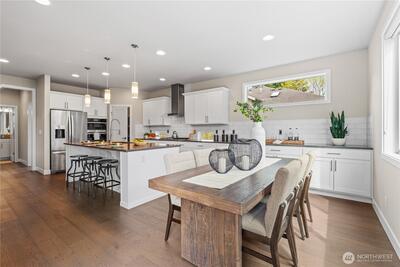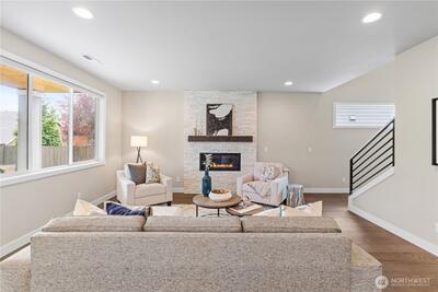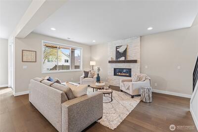 Contemporary like-new, beautifully designed home offers seamless living. The heart of the home is the spacious great room with a stacked stone accent fireplace, bathed in light with sliding doors to the rear deck and substantial yard. The chef’s kitchen features a large center island with quartz slab counters, a walk-in pantry and dining room lined with a built-in buffet. The flowing floor plan offers a main floor bedroom and bathroom as a perfect guest retreat. The upper floor includes the sumptuous primary suite with a sitting area, a generous customized walk-in closet and a luxurious spa bath with a walk-in shower and soaking tub, fit for a queen. Three guest suites, a play room/media center, open foyer for flexible spaces/office complete the upper floor. Enjoy year round entertaining on the covered patio overlooking the level, grassy backyard. A considerable driveway allows for ample parking in addition to an oversized two car garage. Minutes to downtown Bothell’s upscale resta